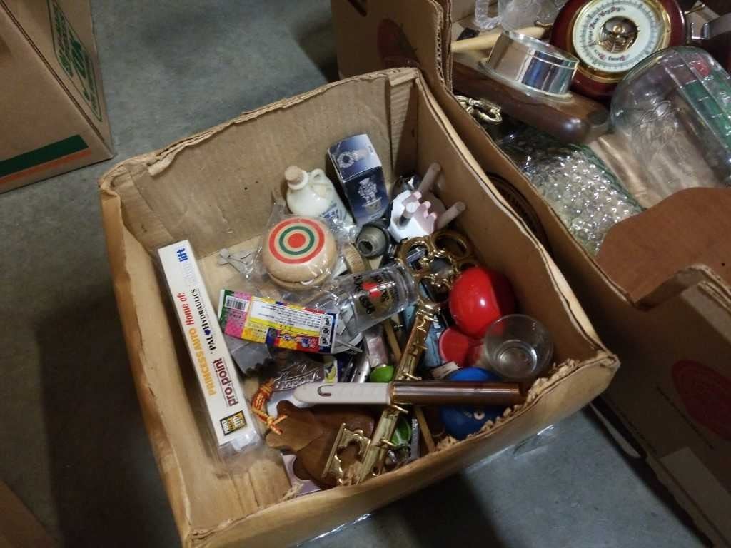 BOX OF COLLECTABLES, BAROMETERS, MIRROR