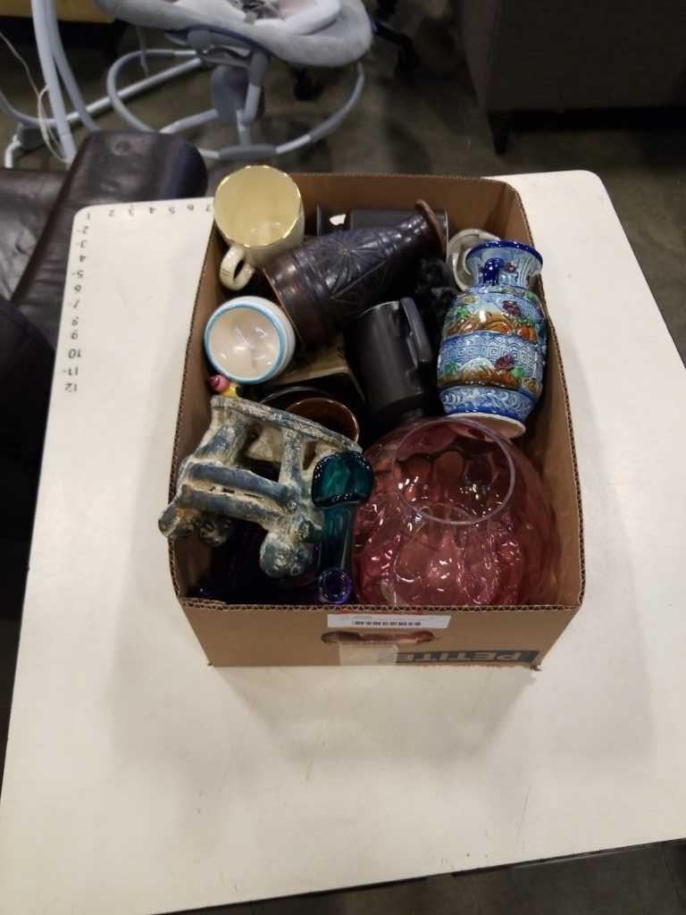 BOX OF COLLECTIBLE SIGNED POTTERY AND ART GLASS