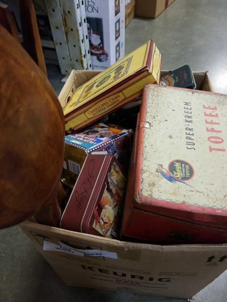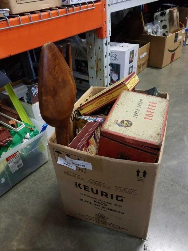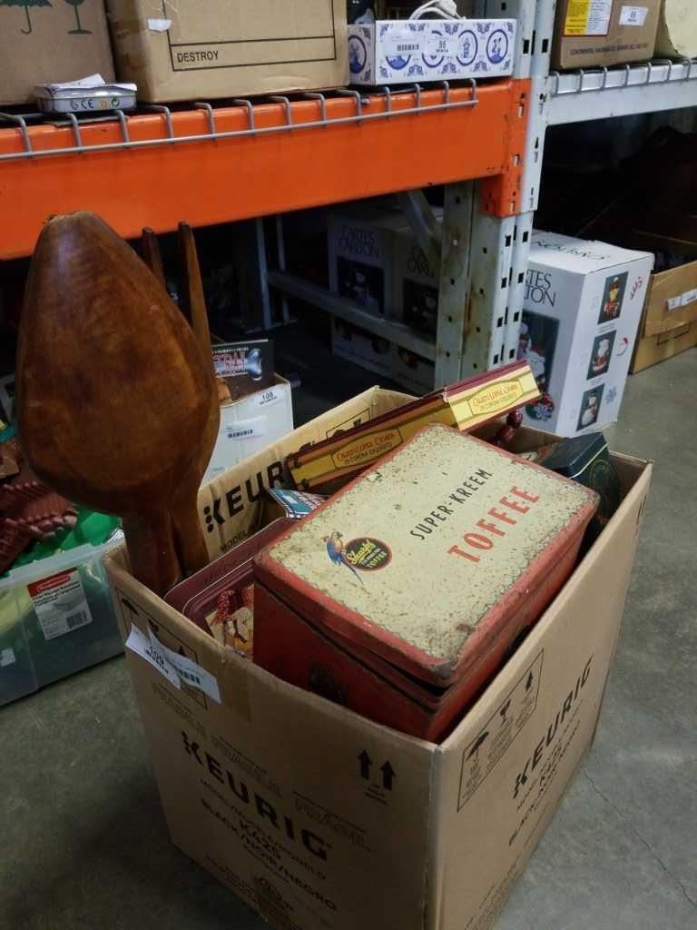 BOX OF COLLECTOR TINS, LARGE WOOD SPOON AND FORK AND KITCHEN ITEMS