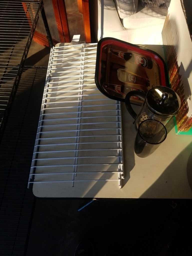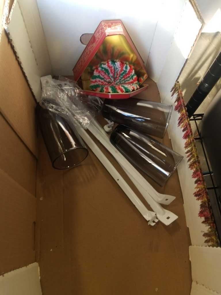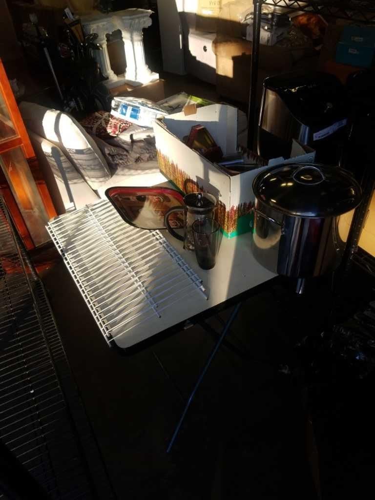 BOX OF COOKPOT, GLASSES, WIRE SHELF, FROTHER AND MORE
