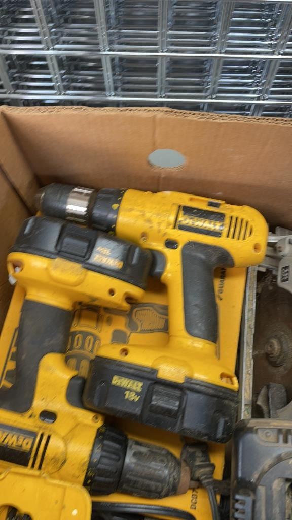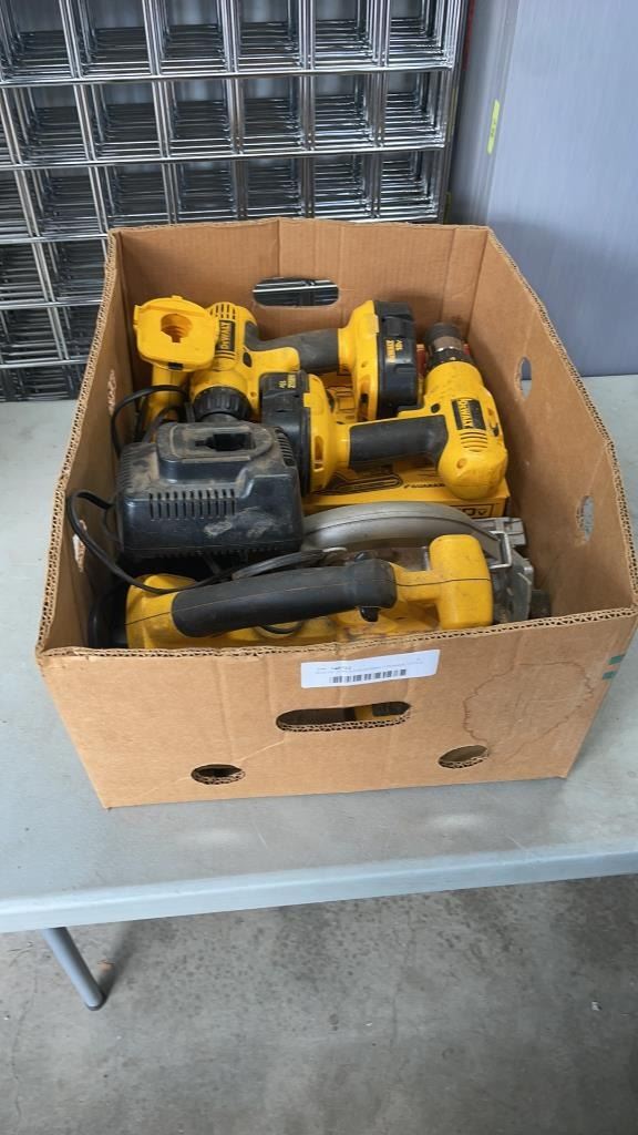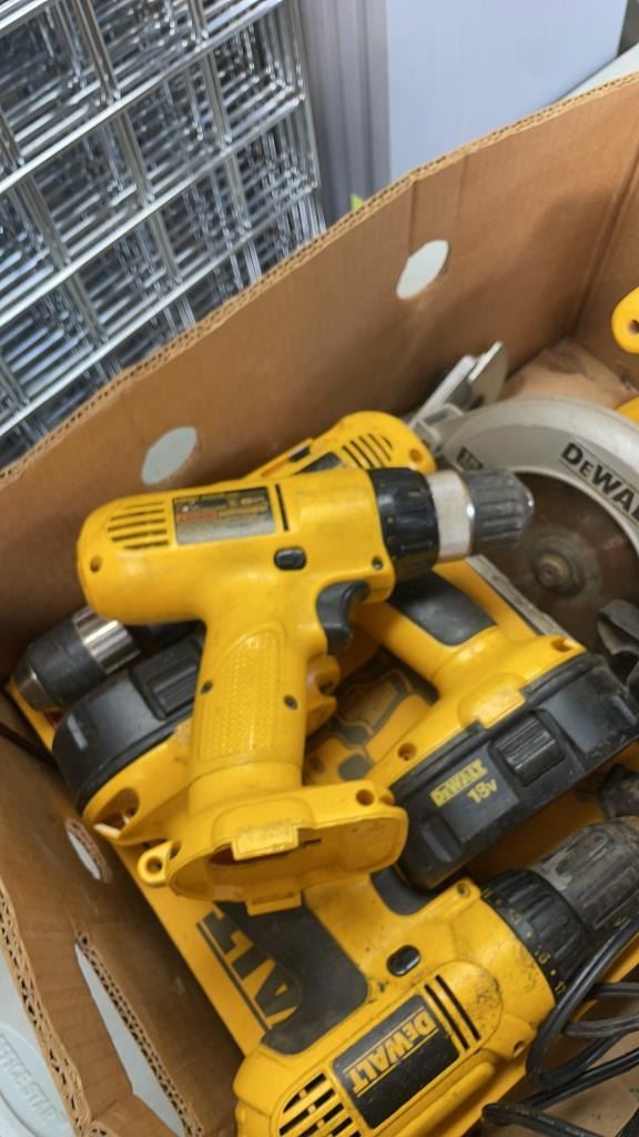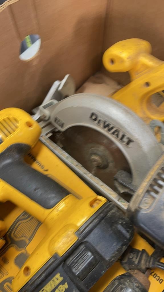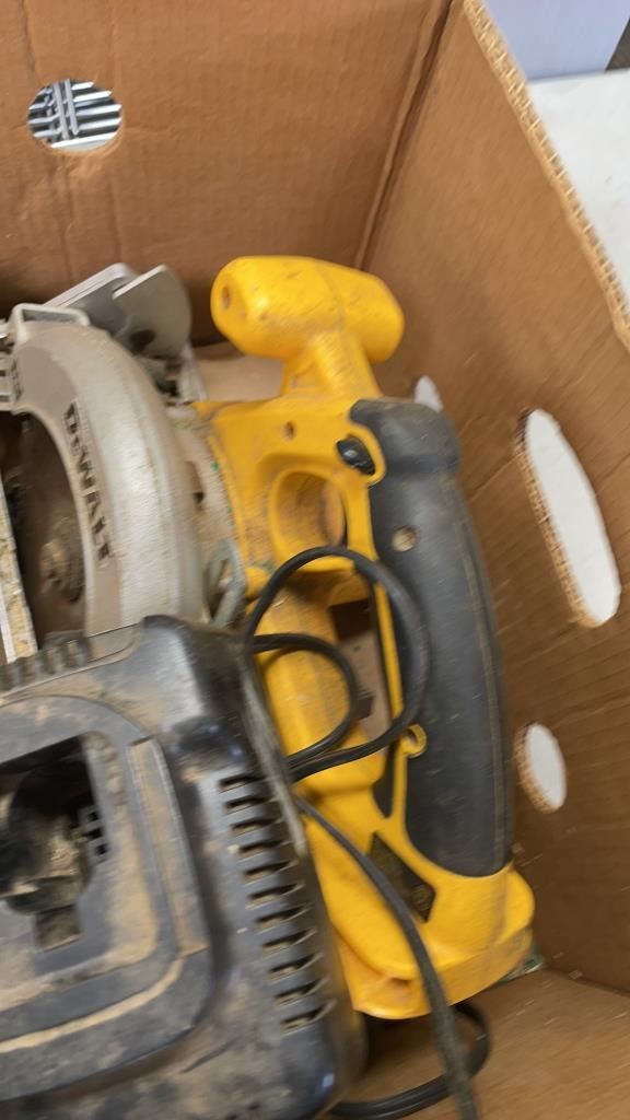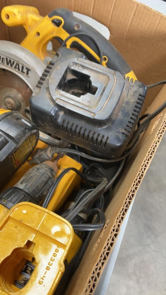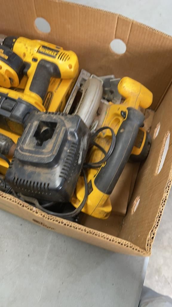 BOX OF CORDLESS DEWALT POWER TOOLS ALL WORKING WITH BATTERY AND 2 CHARGERS
