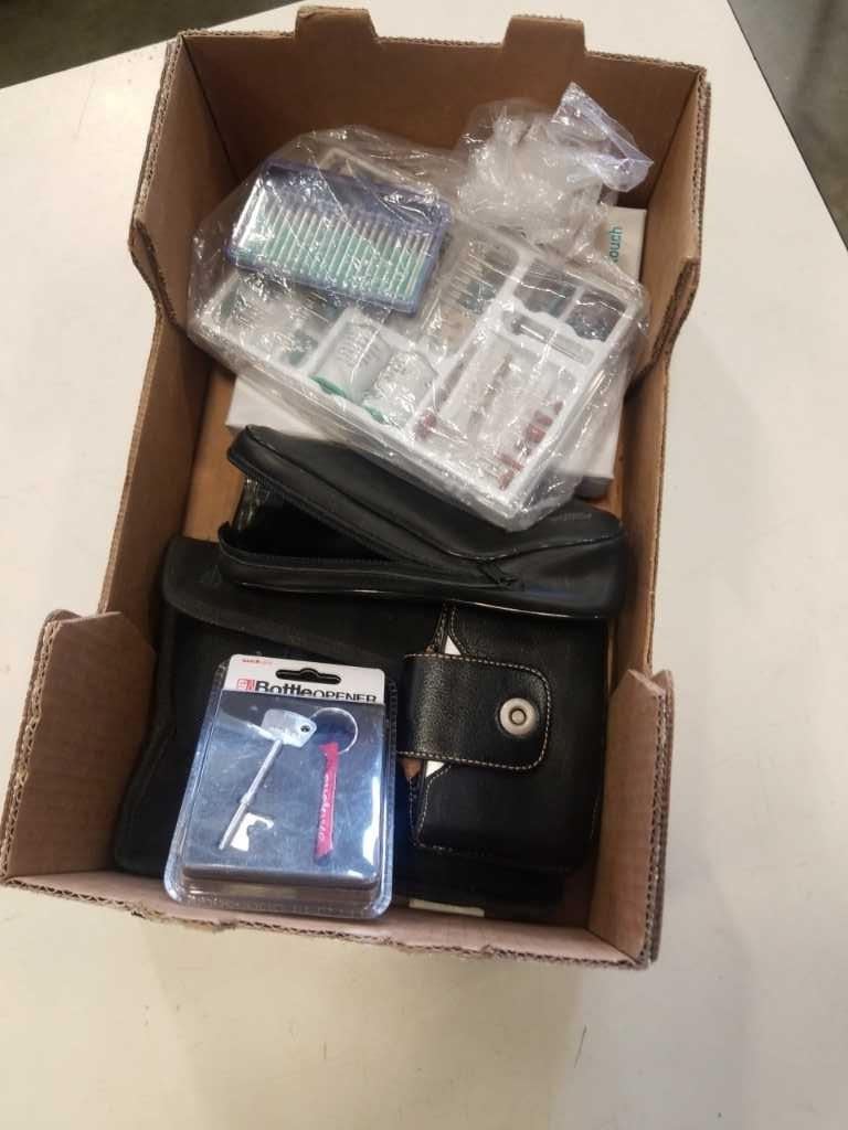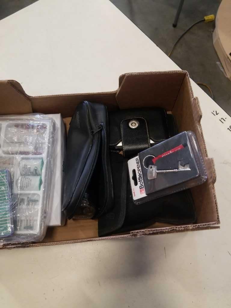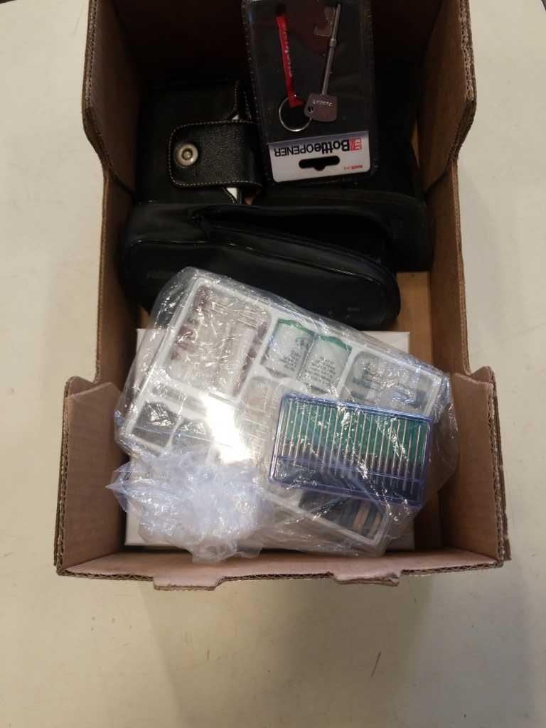 BOX OF CORDLESS SHAVER, BOTTLE OPENER, DREMEL BITS AND MORE