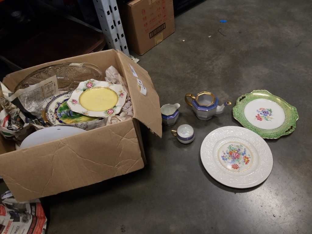 BOX OF CRYSTAL, BAVARIA TEAPOT, CREAM AND SUGAR AND CHINA PLATES