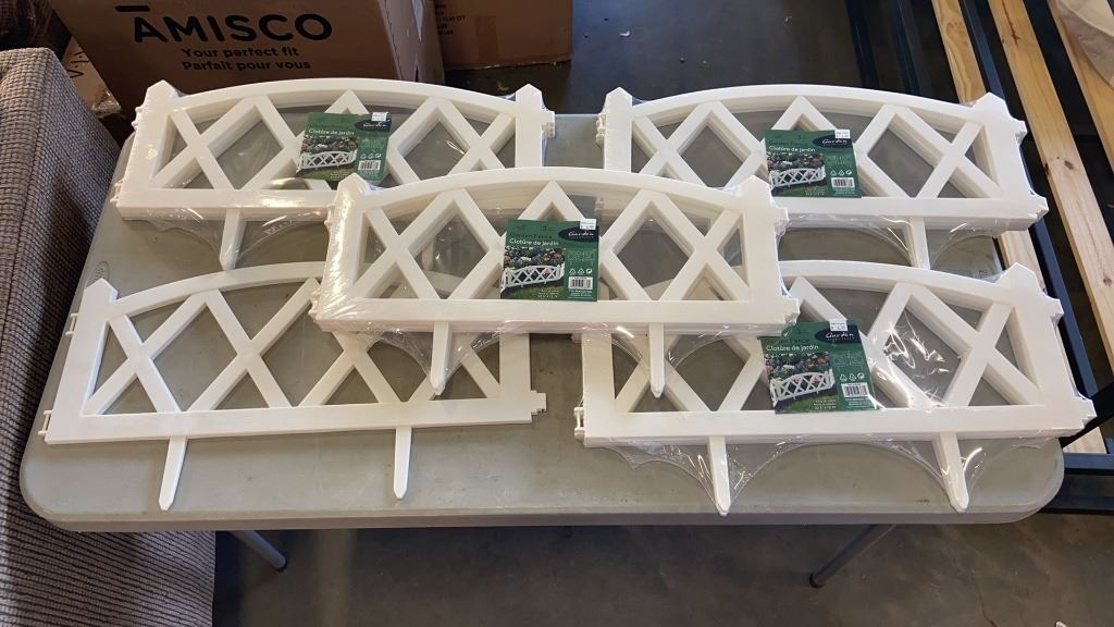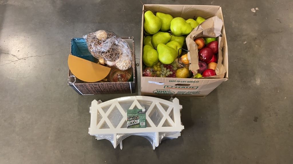 BOX OF DECORATIVE FRUIT, NEW GARDEN FENCING, AND HOME DECOR