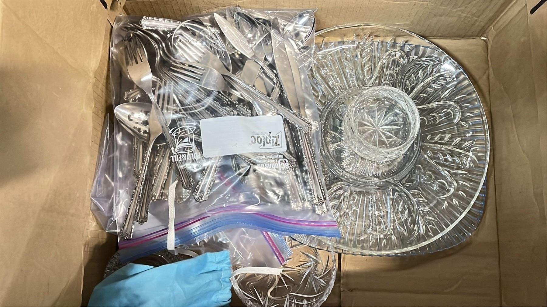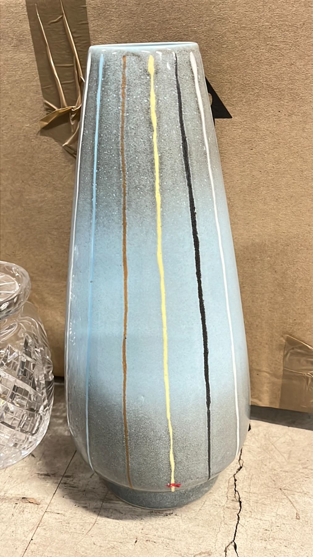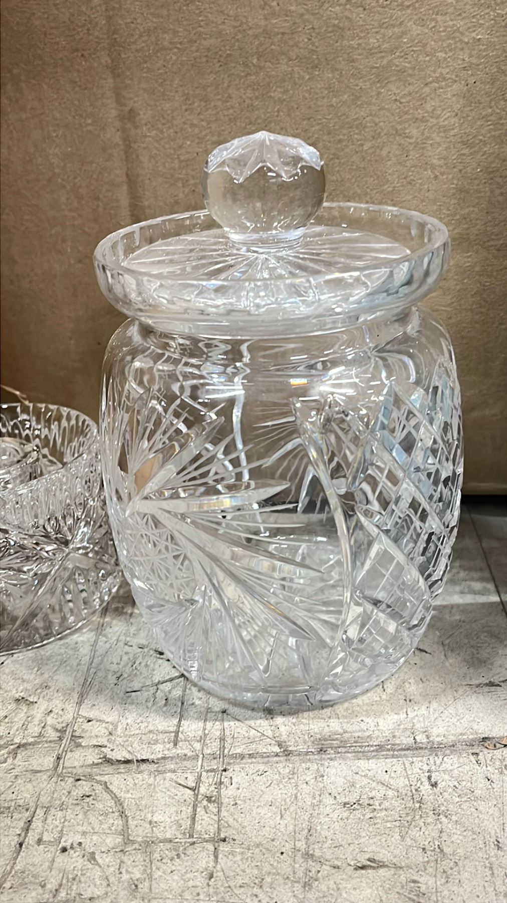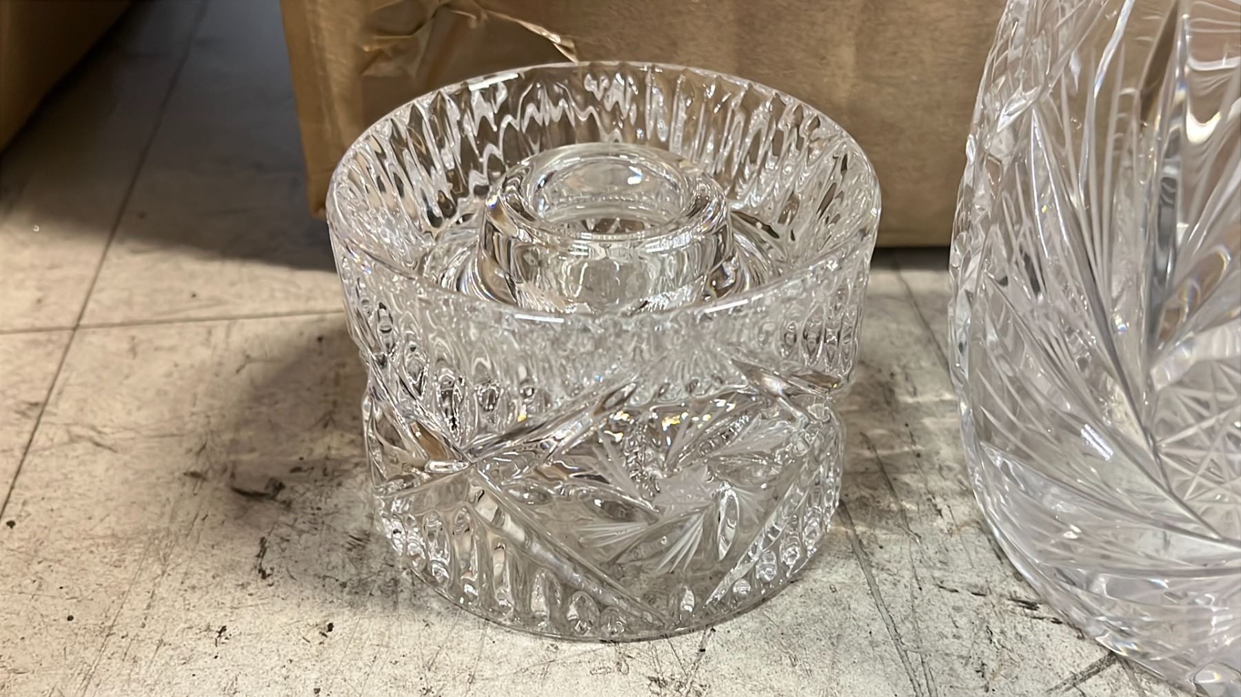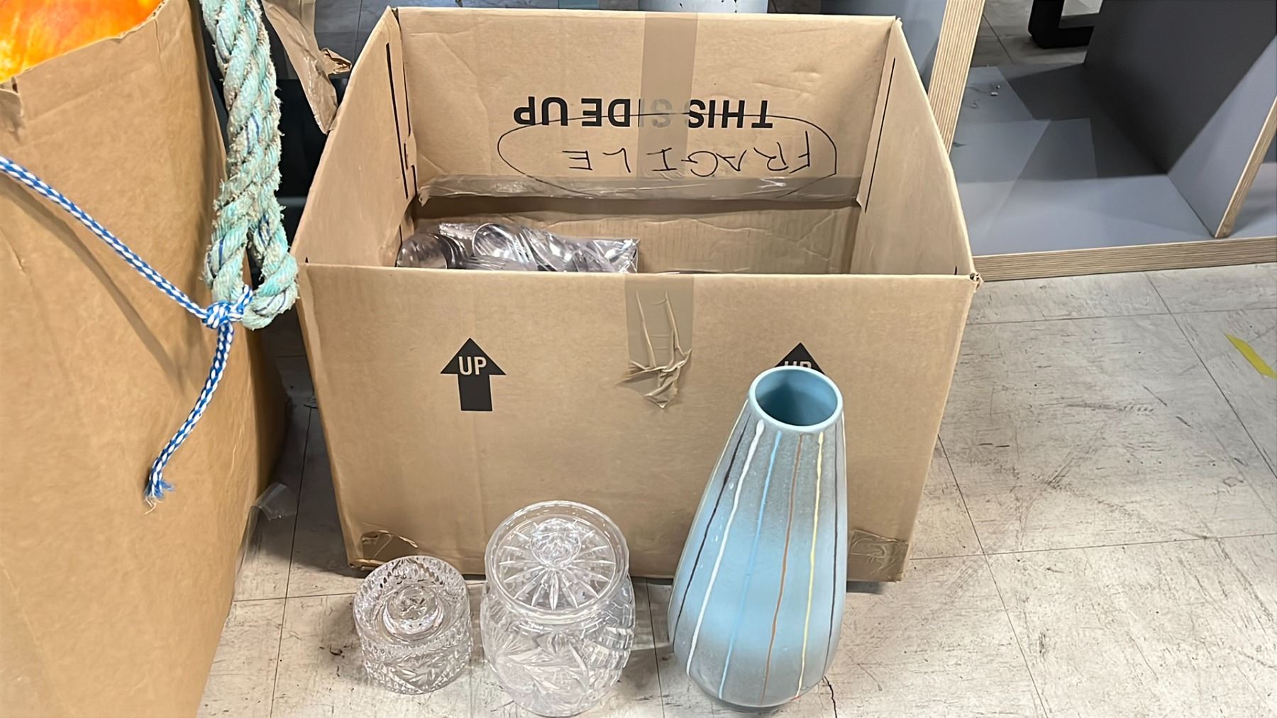 BOX OF DECORATIVE GLASSWARE & A BLUE VASE