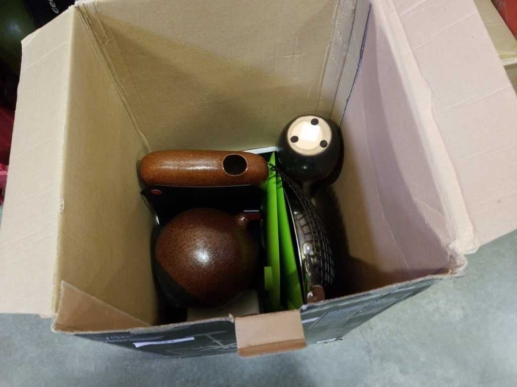 BOX OF DECORATIVE VASES AND COOKING ITEMS, PAN