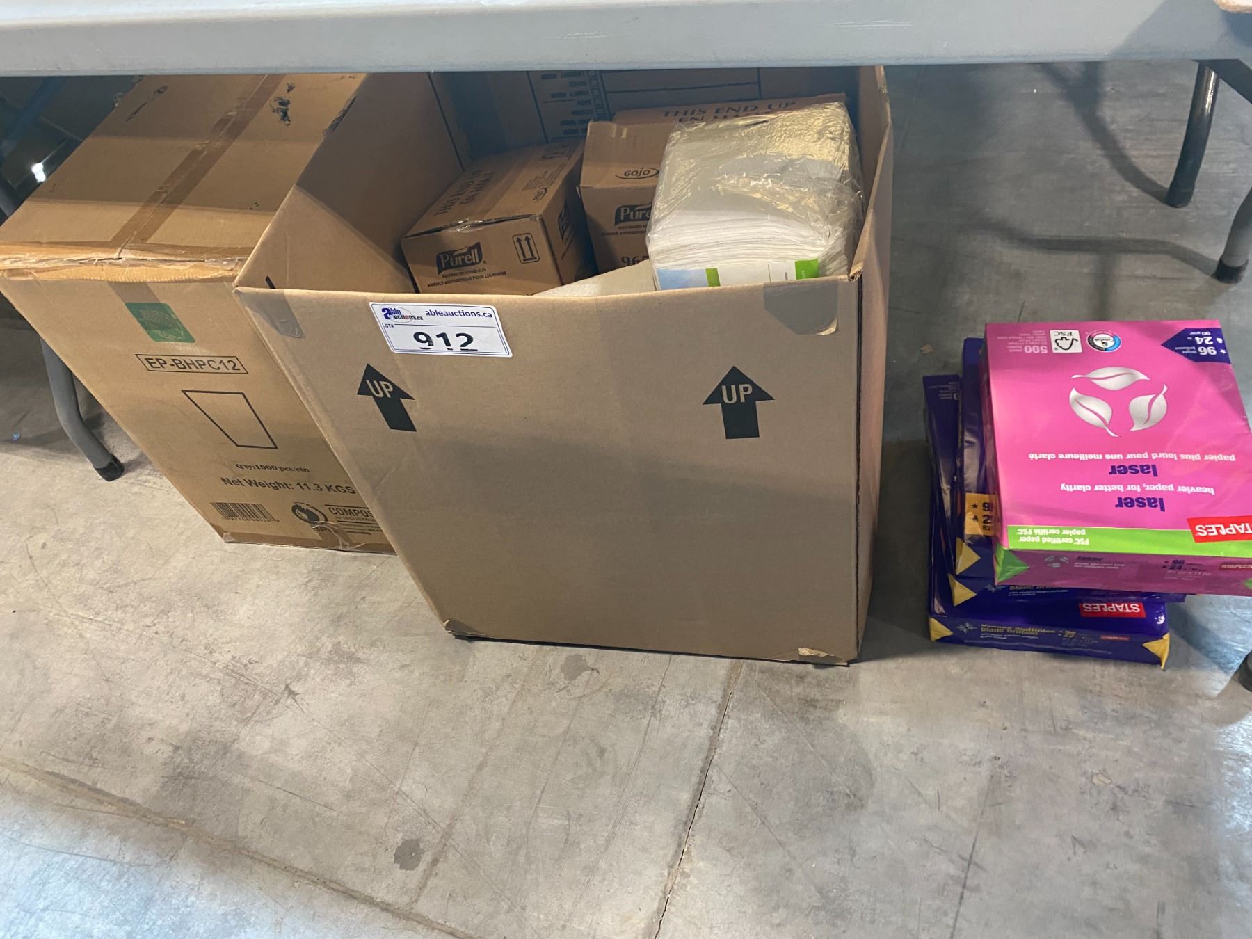 BOX OF DISPOSABLE CUPS, BOX OF ASSORTED OFFICE SUPPLIES AND 4 PACKS OF PRINTER PAPERS