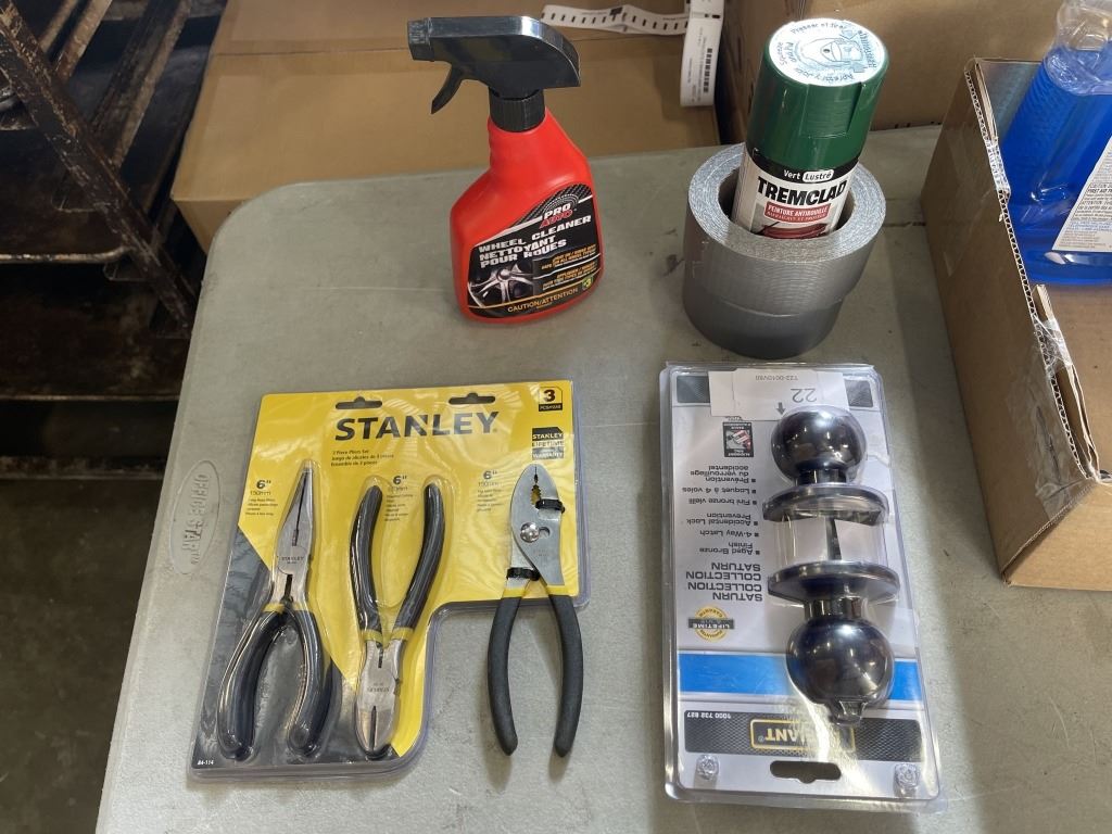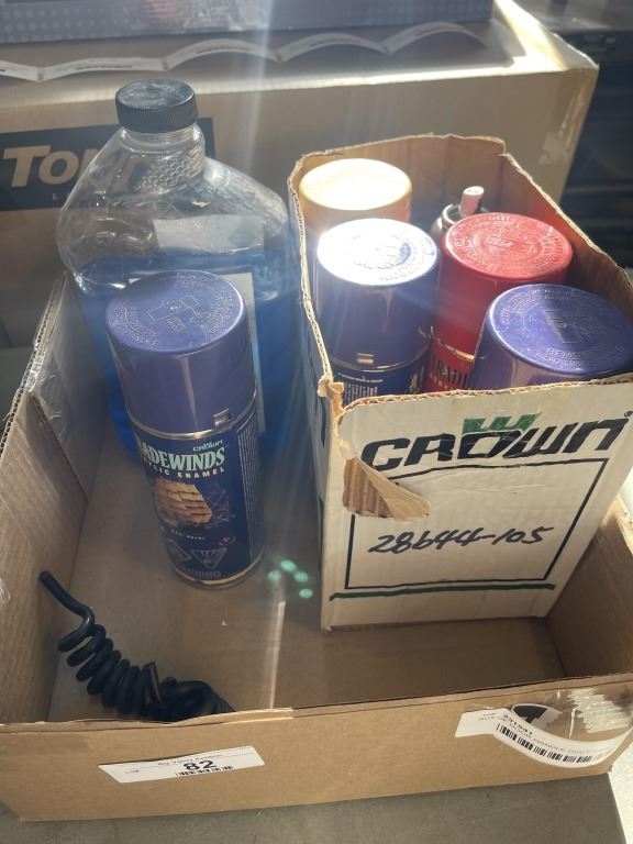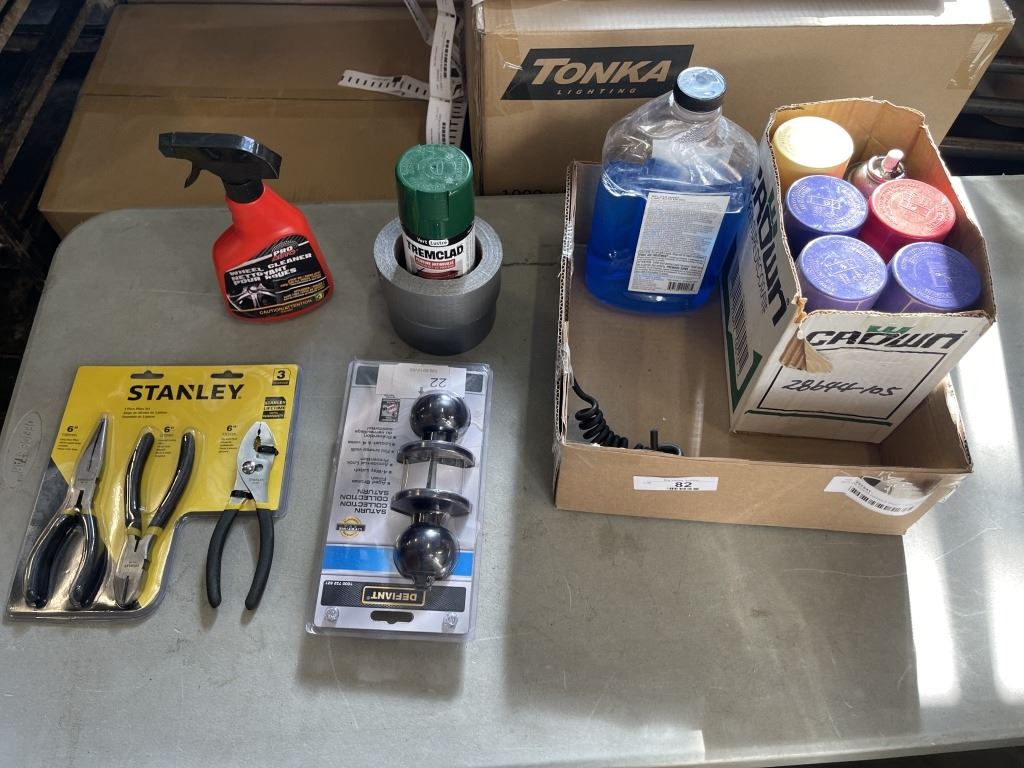 BOX OF DOOR HANDLE DUCT TAPE, PAINT, TOOLS