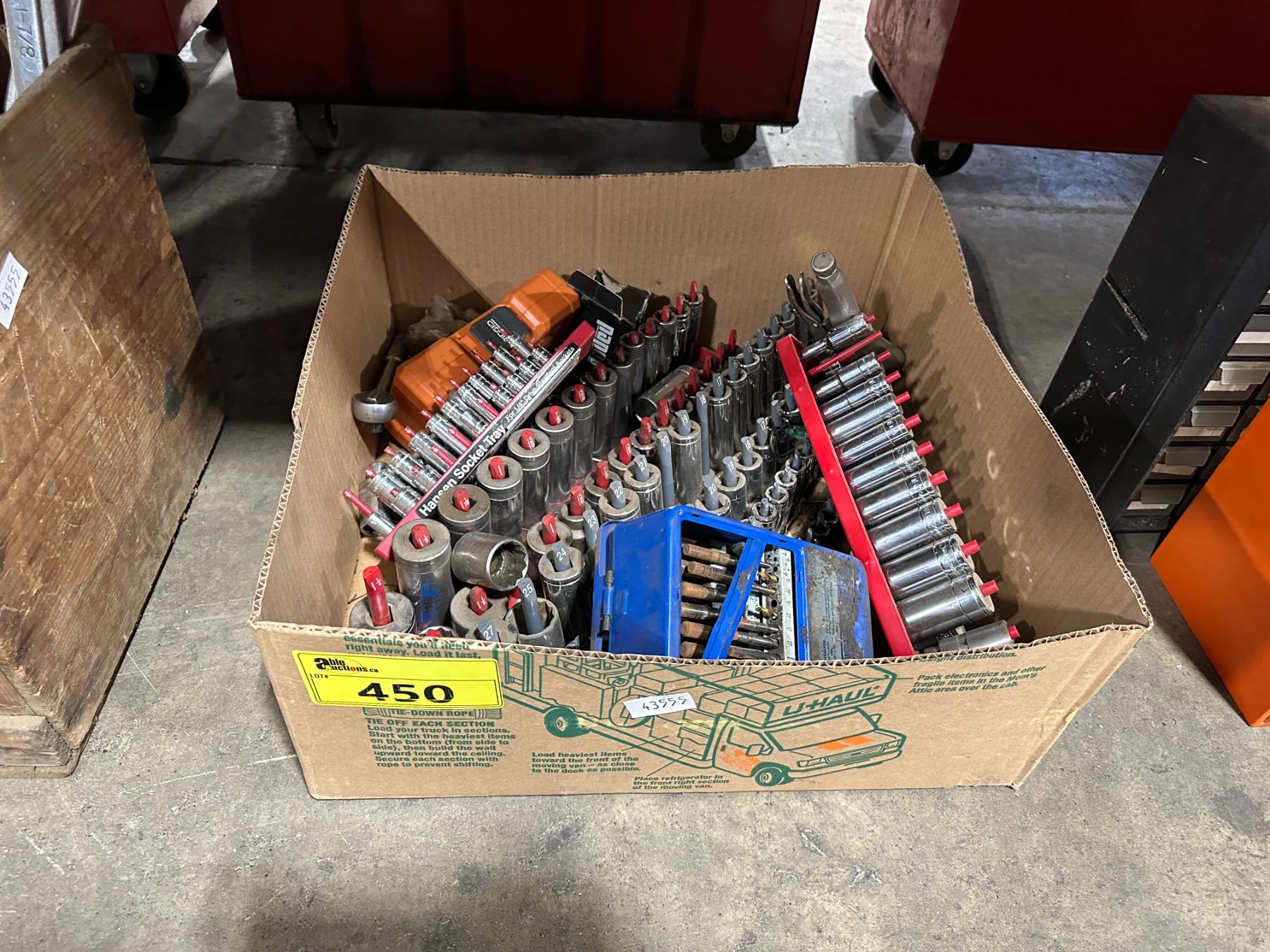 BOX OF DRILL BITS & SOCKET SETS ON SORTERS