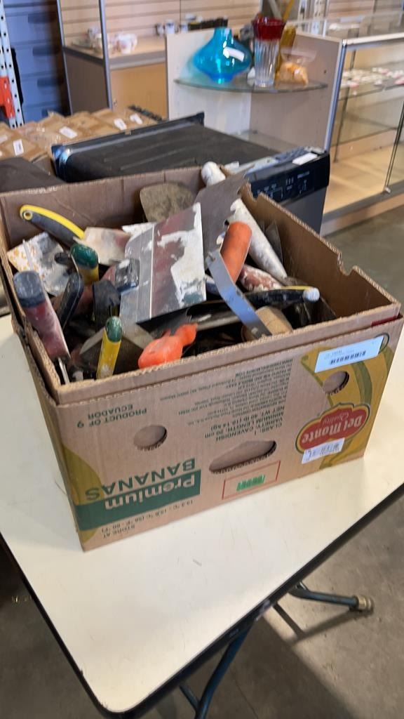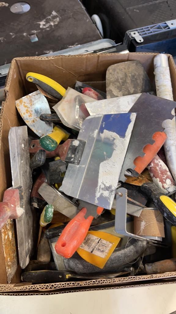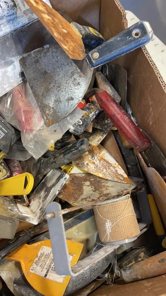 BOX OF DRYWALL TOOLS