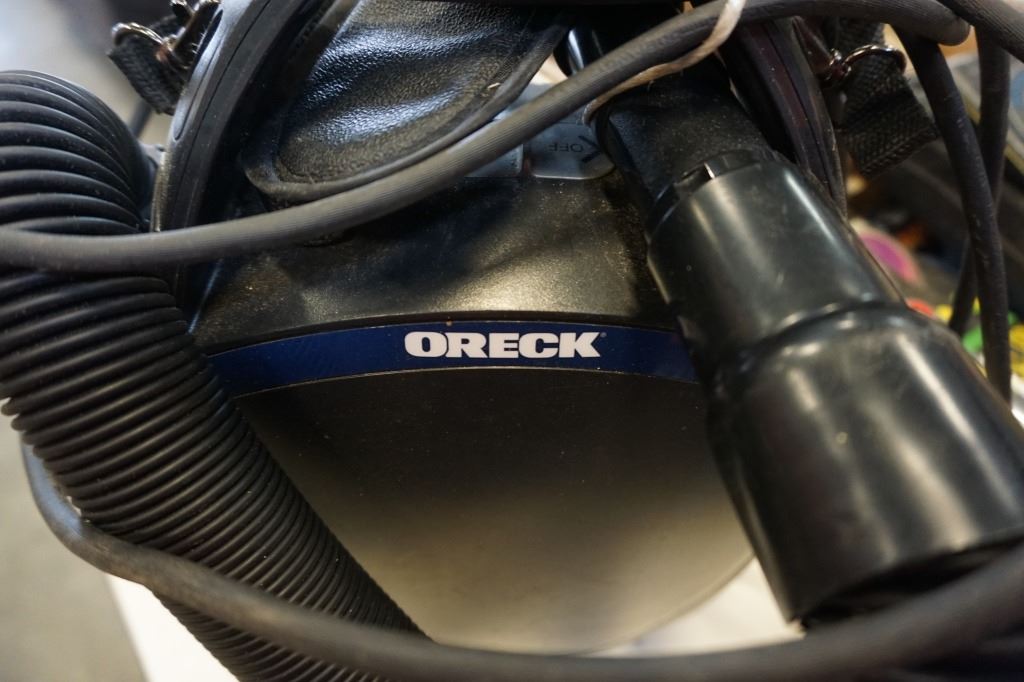 BOX OF DVDS, CDS, NEW VHS TAPES AND ORECK PORTABLE VACUUM