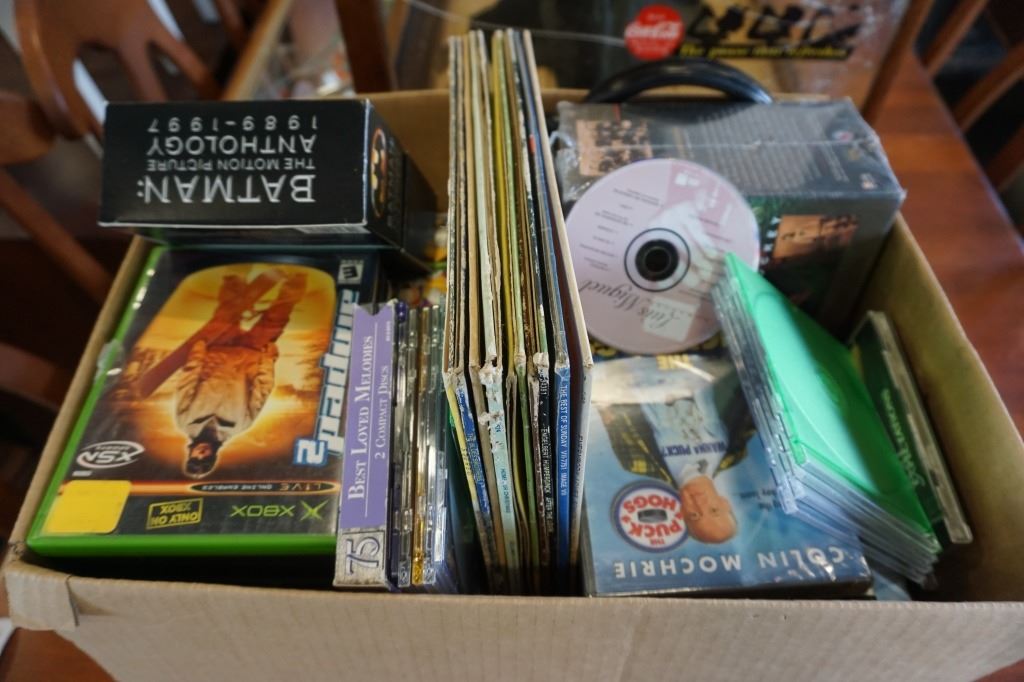 BOX OF DVDS, RECORDS, CDS