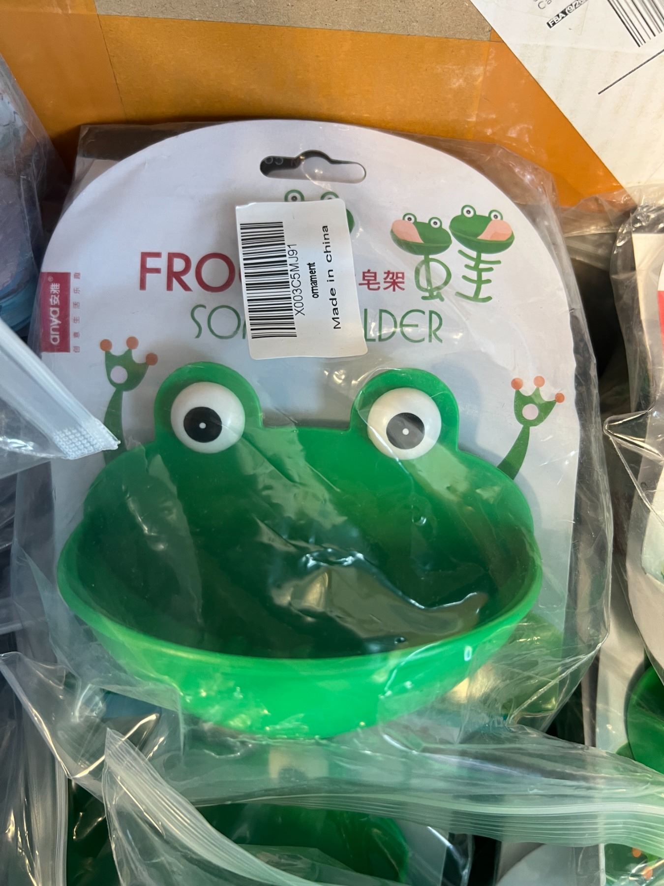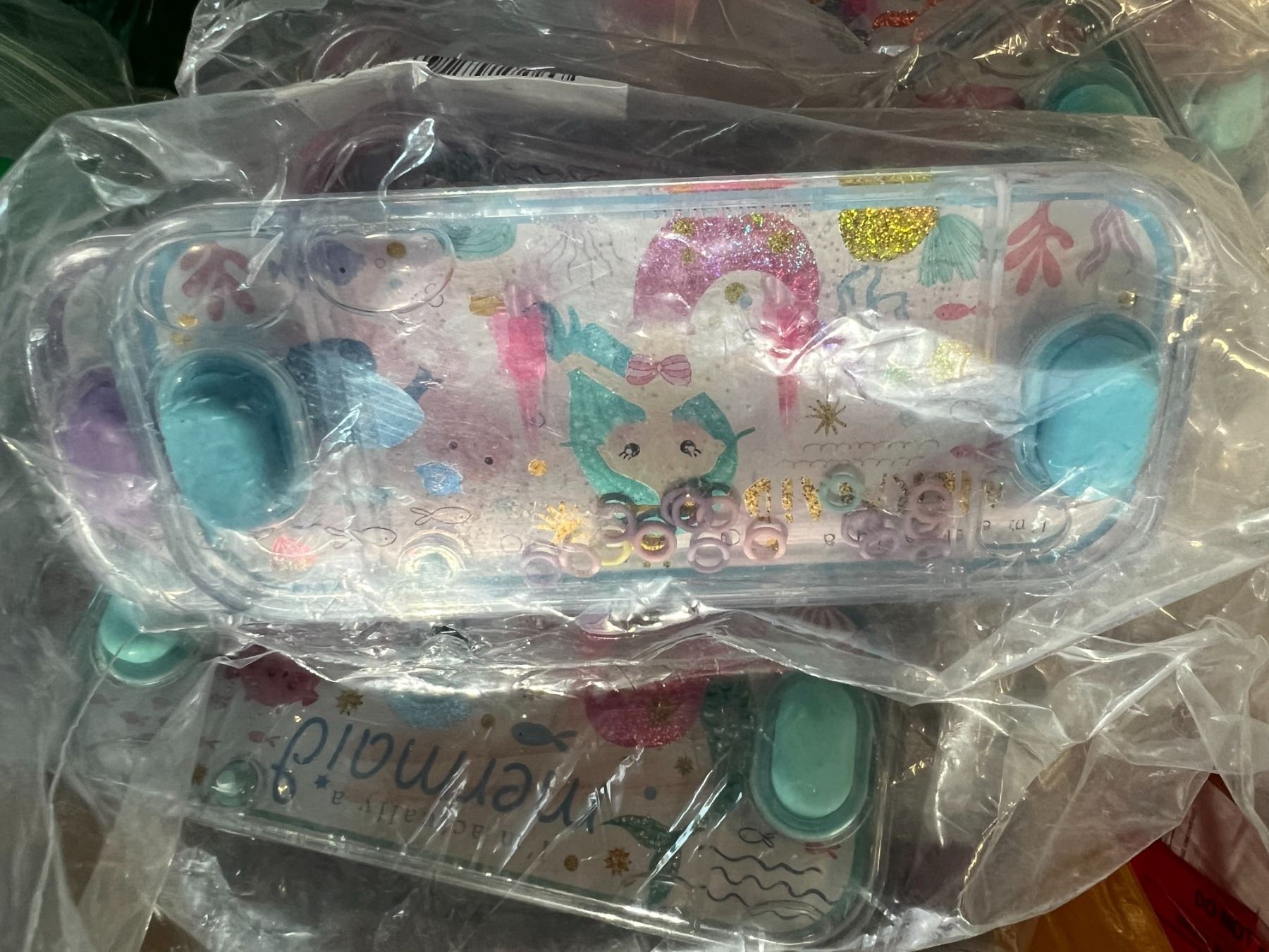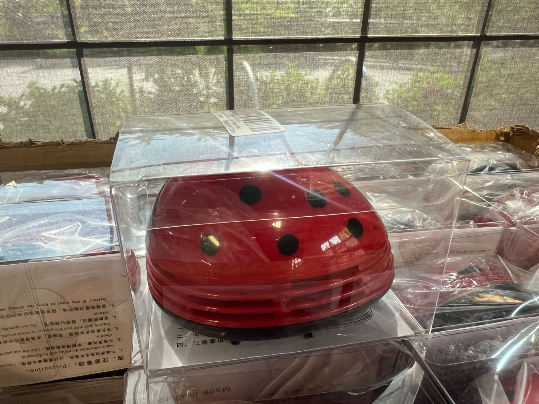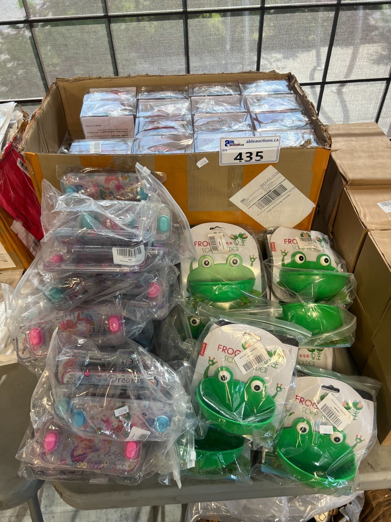 BOX OF ELECTRIC LADY BUG DUST CLEANERS, FROG SOAP HOLDERS AND MERMAID RING GAMES
