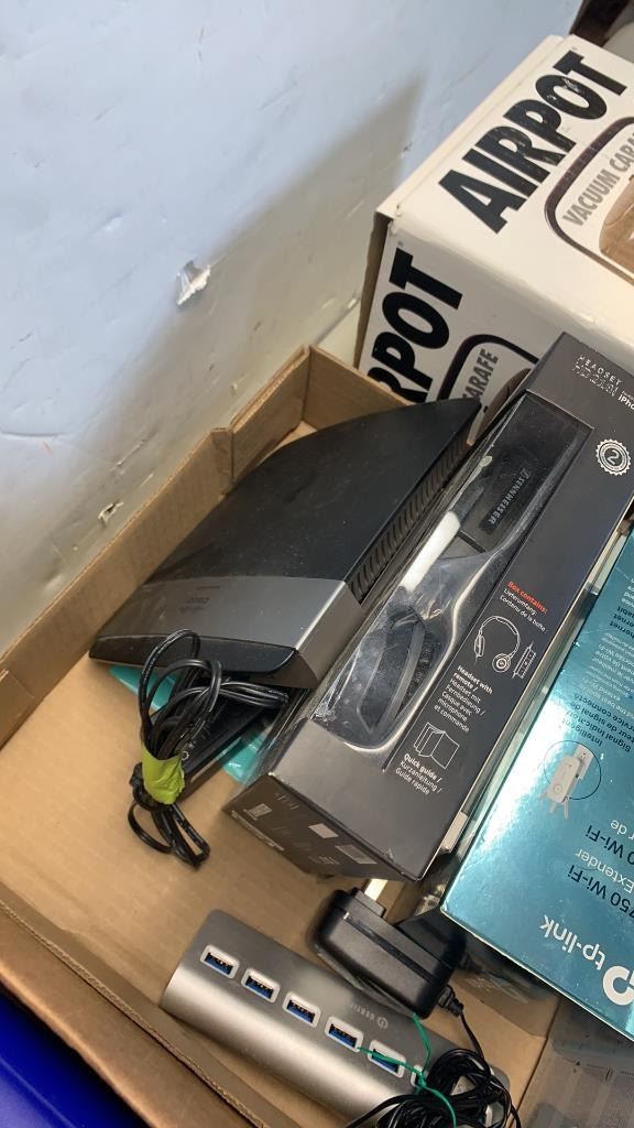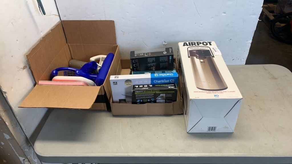 BOX OF ELECTRONICS, COMUPTER ITEMS AND AIRPOT COFFEE CARAFE