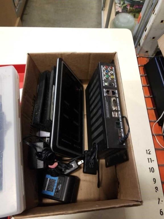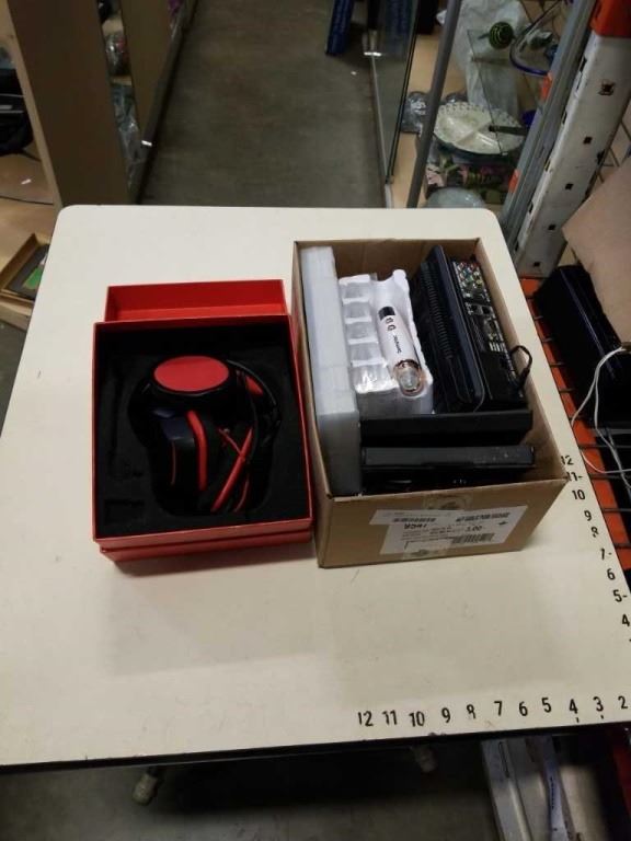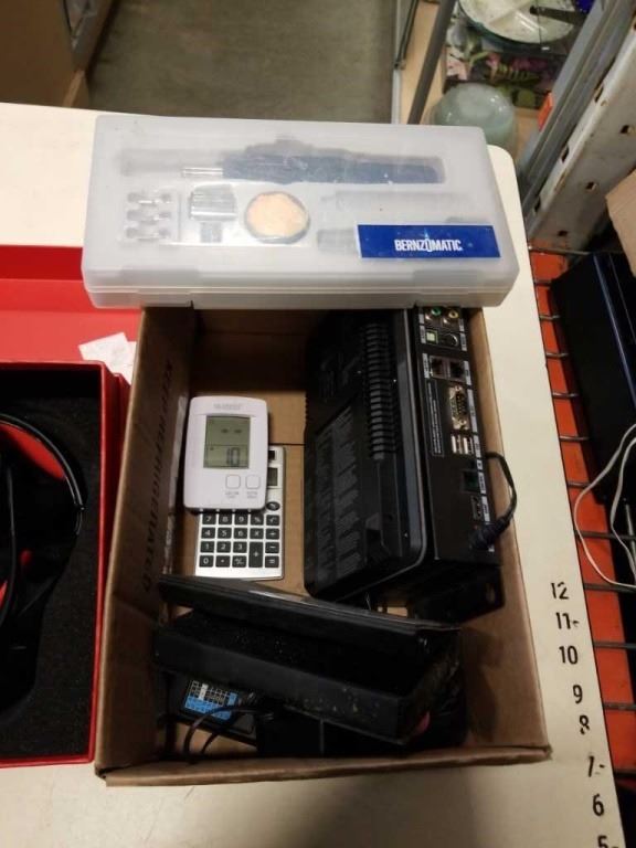 BOX OF ELECTRONICS, HYPEX X HEASET CRACKED ARM, MICROPHONE, FACE VACUUM AND BENZOMATIC TORCH KIT