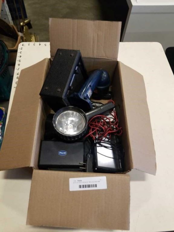 BOX OF ELECTRONICS, MINI GUITAR AMP, GPS, BATTERY CHARGER, AND MORE EVERYTHING EXCEPT LIGHTS ARE TESTED WORKING