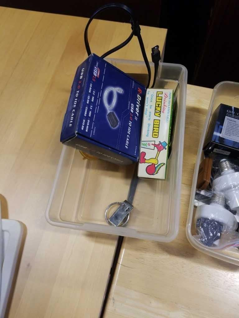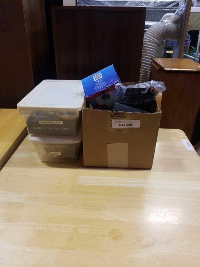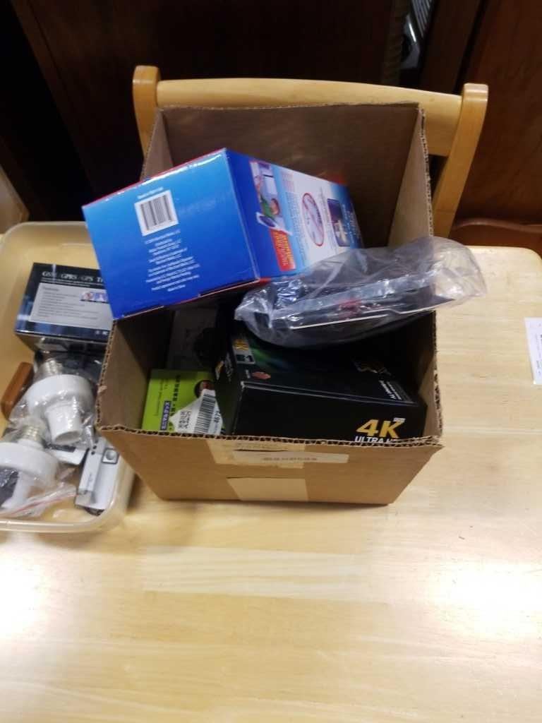 BOX OF ELECTRONICS, OTT 4K TV BOX, BOG GLOVES, AND SPEAKERS