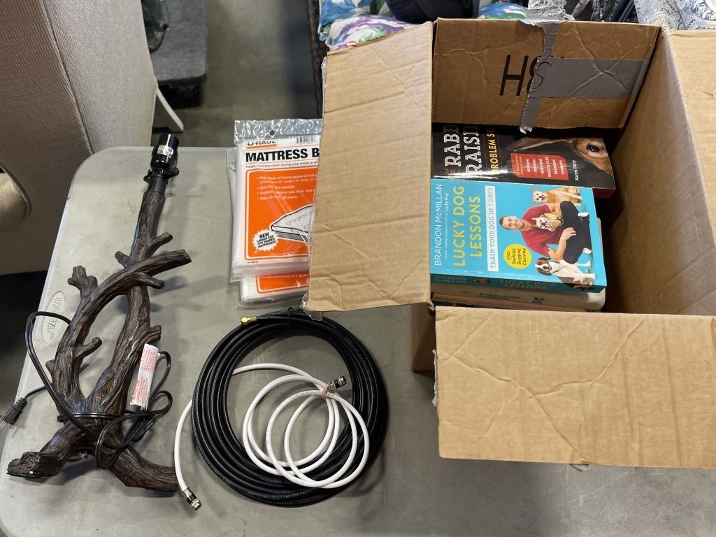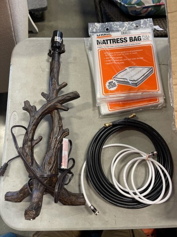 BOX OF ESTATE GOODS, TABLE LAMP, MATTRESS BAGS AND MORE