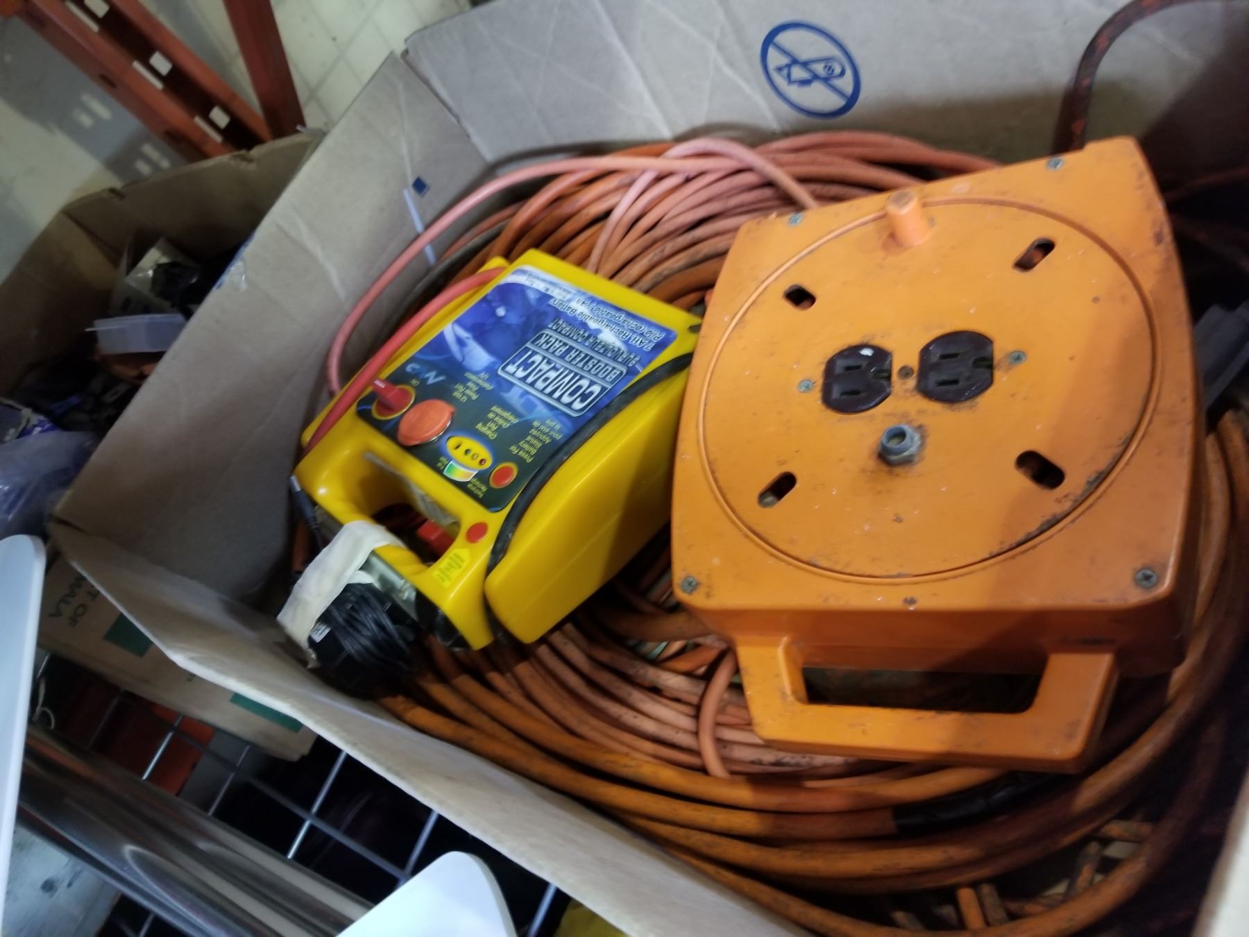 BOX OF EXTENSION CORDS AND BOX OF CAMP STOVE, ETC