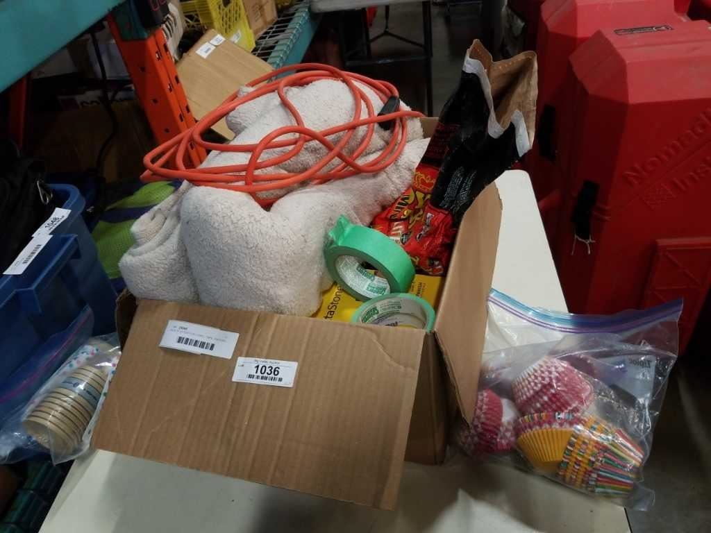 BOX OF EXTENTION CORD, TAPE, PACKING BLANKET, ETC