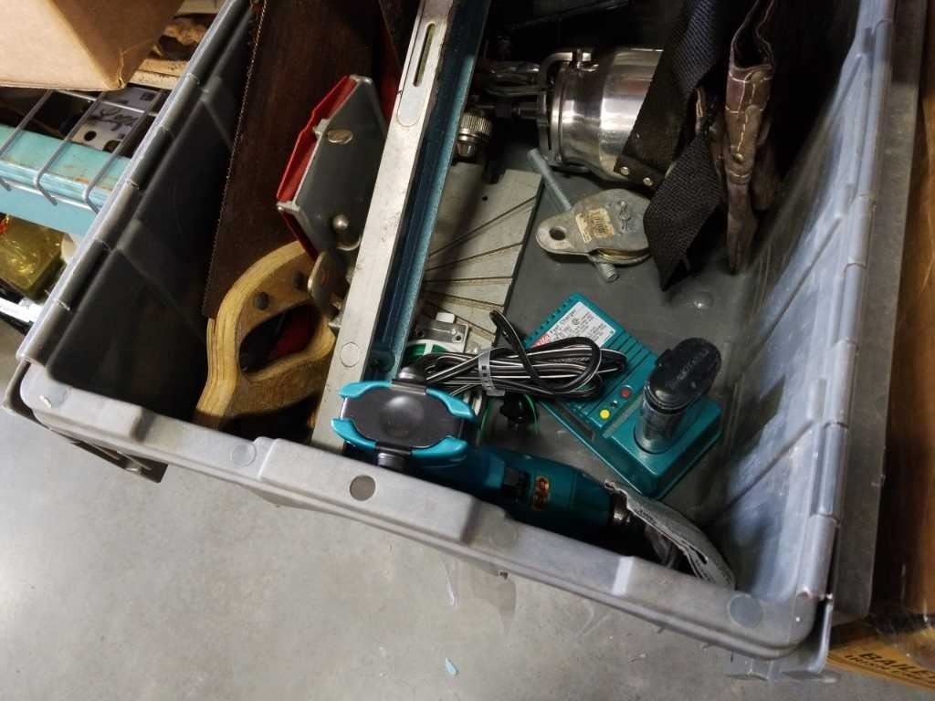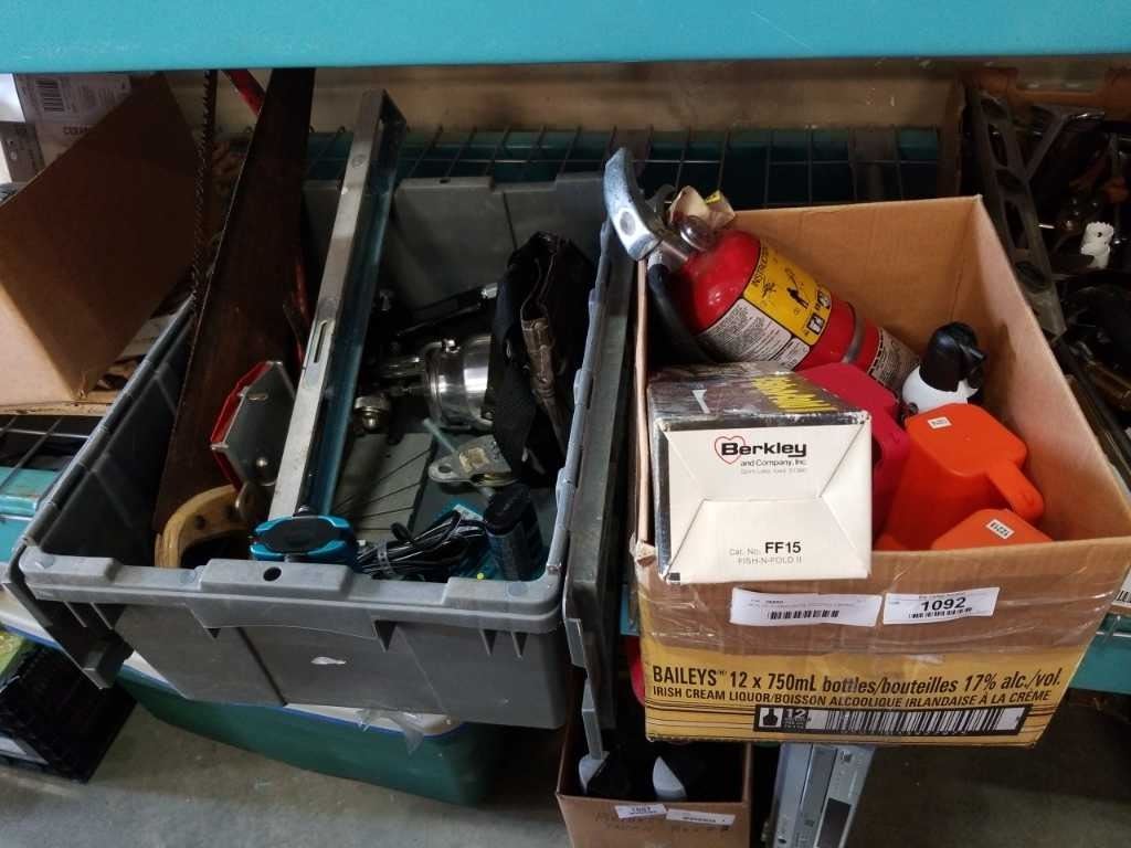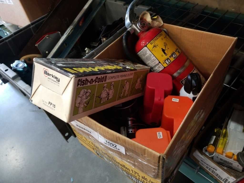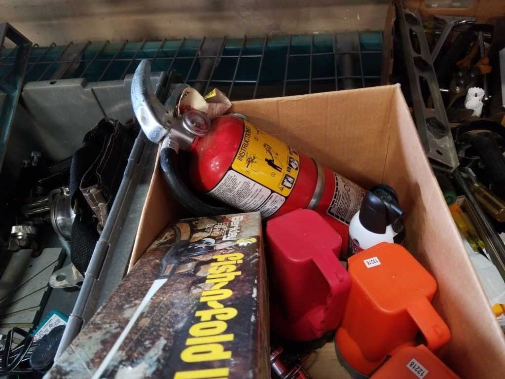 BOX OF FLASHLIGHTS, FOLDING FISHING ROD, QUANTUM REEL AND TOTE OF TOOLS