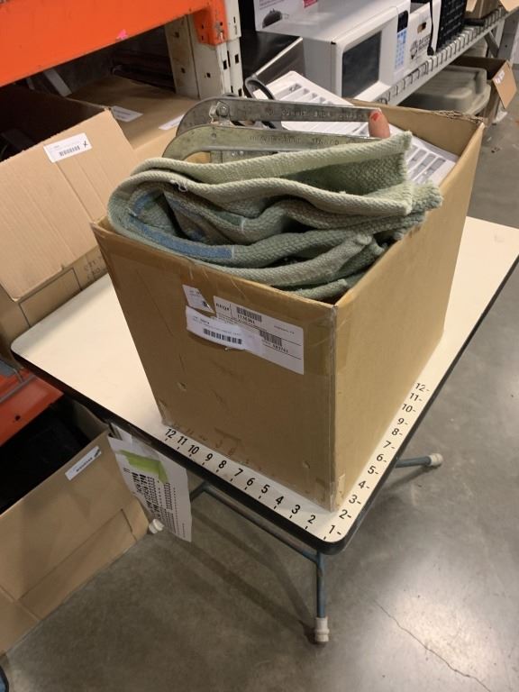 BOX OF FRENCH FRY PRESS, VENT INSERTS, SHAMS, FITTED SHEET AND ESTATE GOODS AND SCISSORS