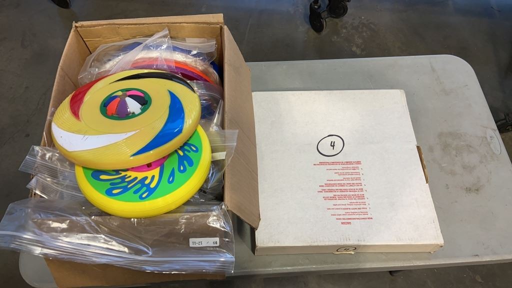 BOX OF FRISBIES AND DISCS