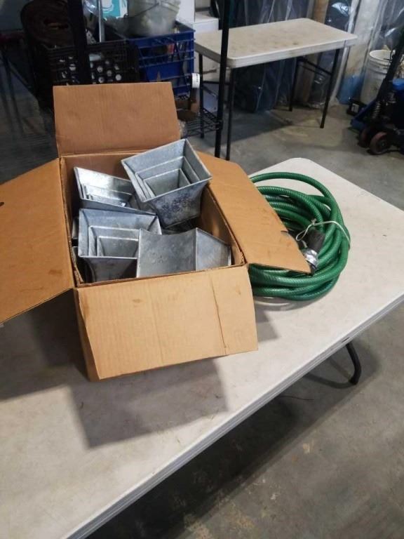 BOX OF GALVANIZED PLANTER POTS AND GARDEN HOSE