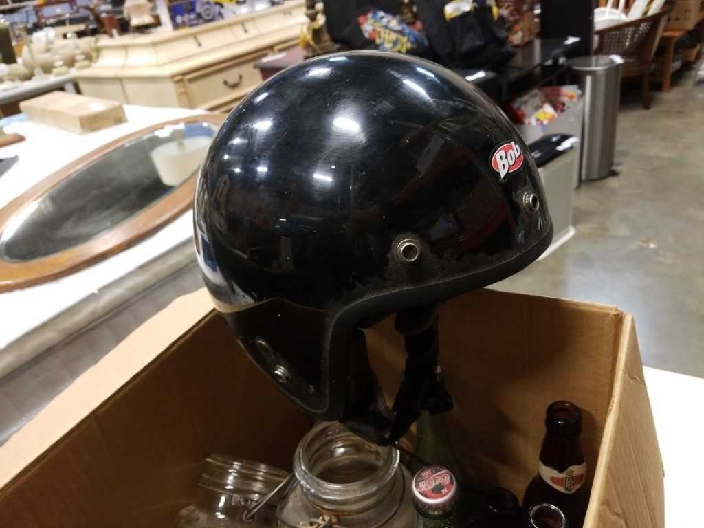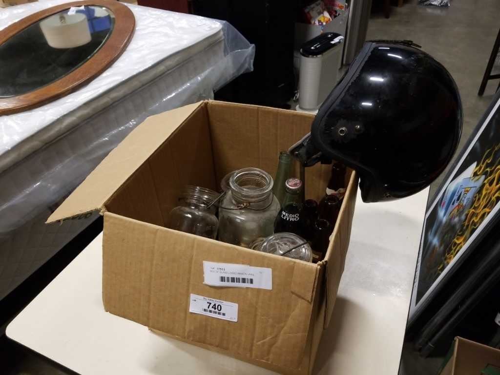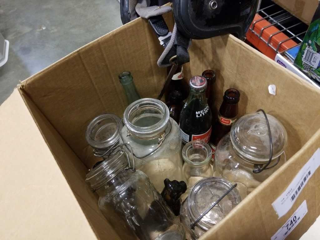 BOX OF GLASS LIDDED MASON JARS, VINTAGE BEER BOTTLES AND DECANTERS AND MOTORCYCLE CALENDERS AND HELMET