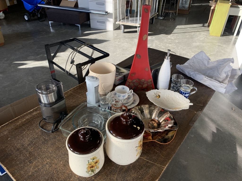 BOX OF GLASSWARE, ANCHOR BOWLS, CANNISTERS, CUISINART COFFEE GRINDER