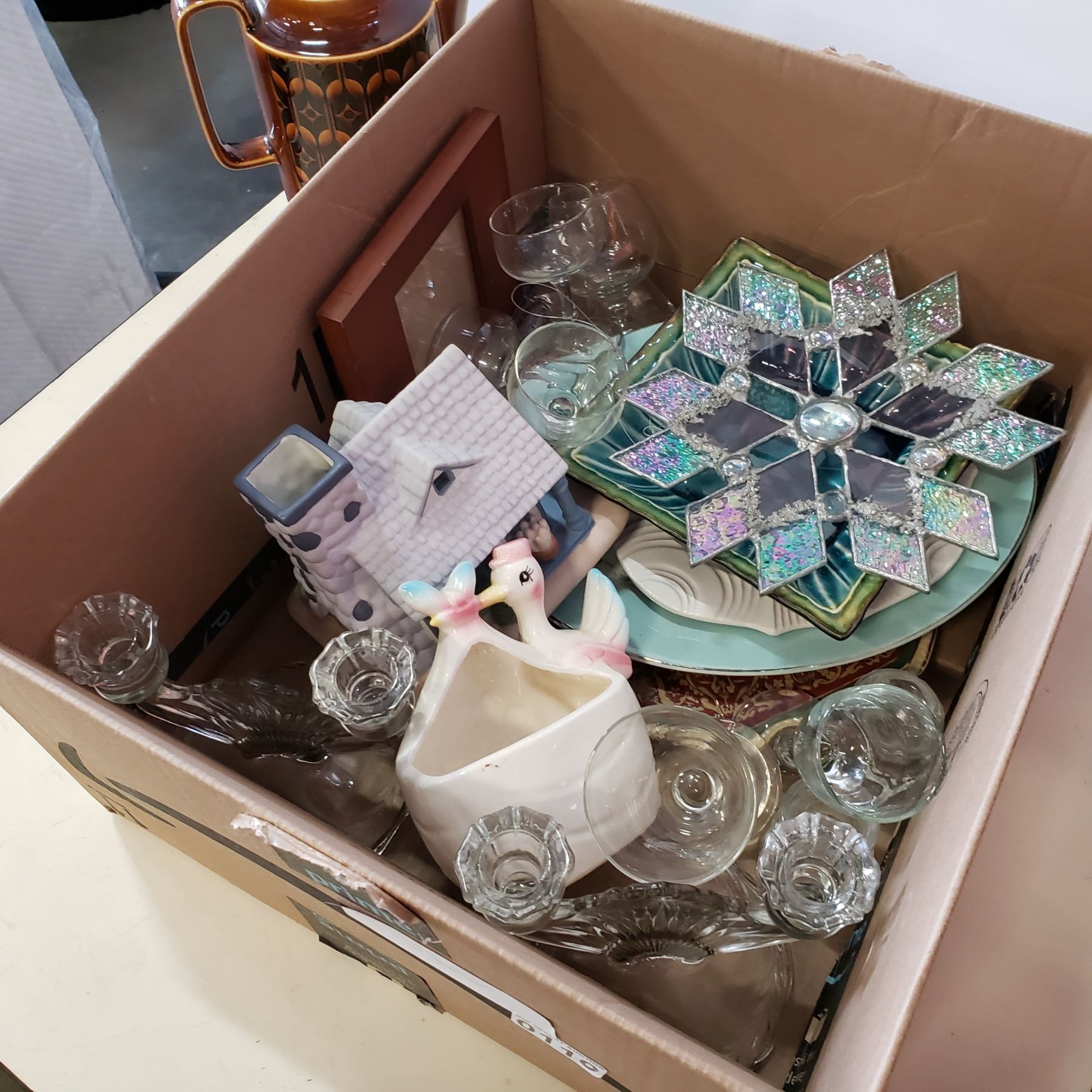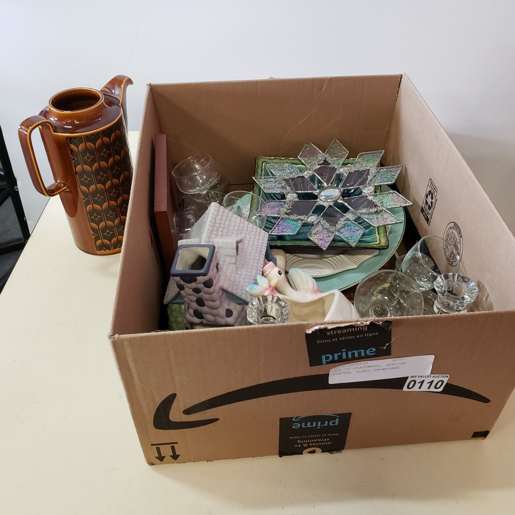 BOX OF GLASSWARE, SERVING PLATES, GLASS SNOWFLAKE