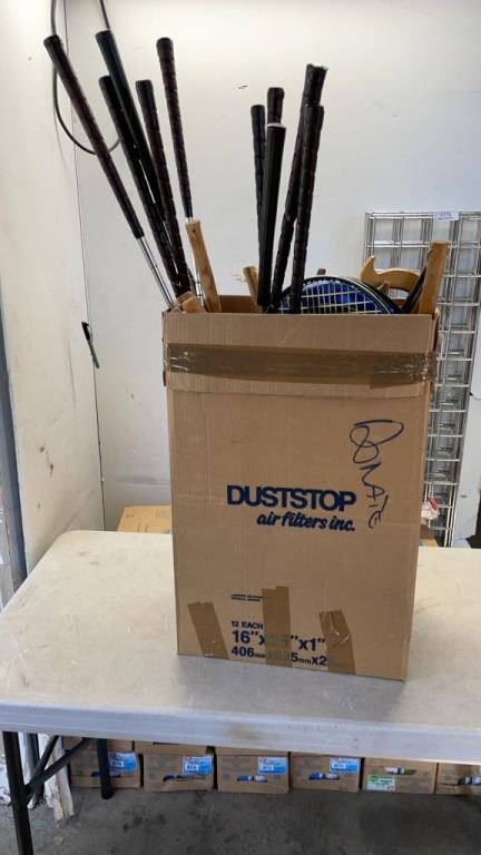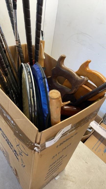 BOX OF GOLF CLUBS HAND SAWS, TENNIS RACKETS