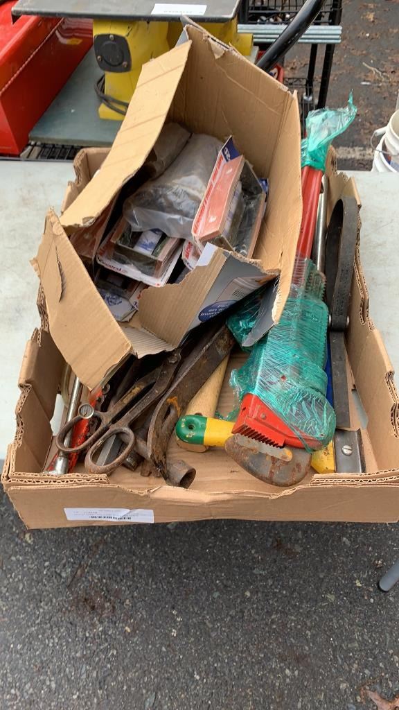 BOX OF HAND TOOLS AND VICE FIBRE GRIPS