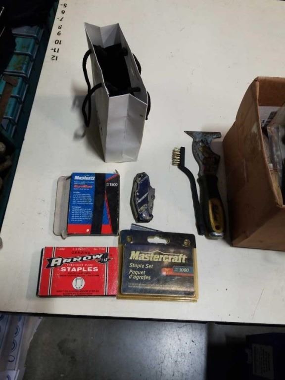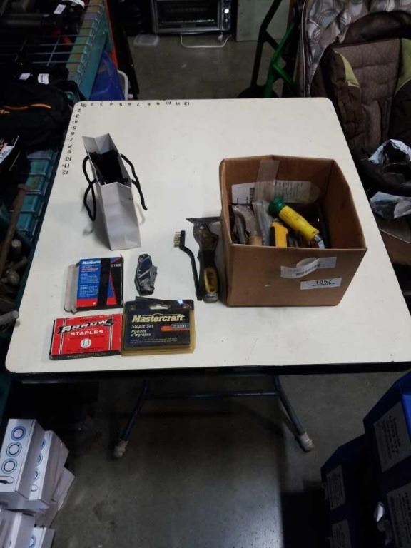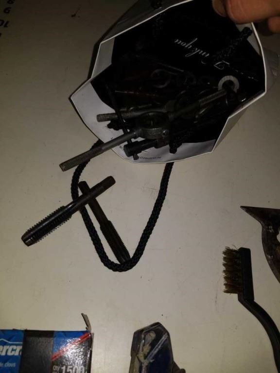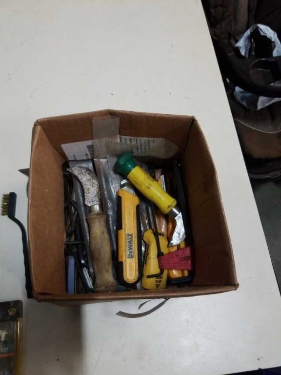 BOX OF HAND TOOLS, UTILITY KNIVES, TAPS AND DIES AND TAP WRENCHES