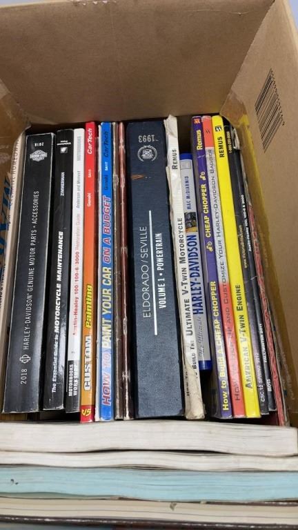 BOX OF HARLEY DAVIDSON, HARDCOVERS, AUSTIN HEALEY AND MORE