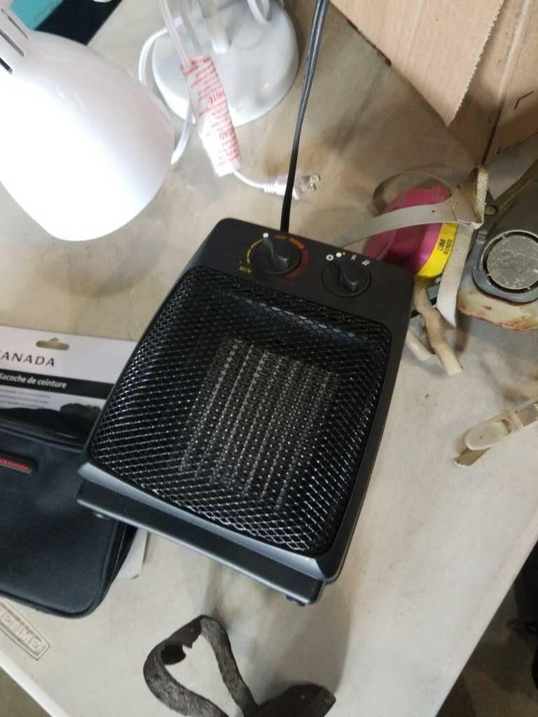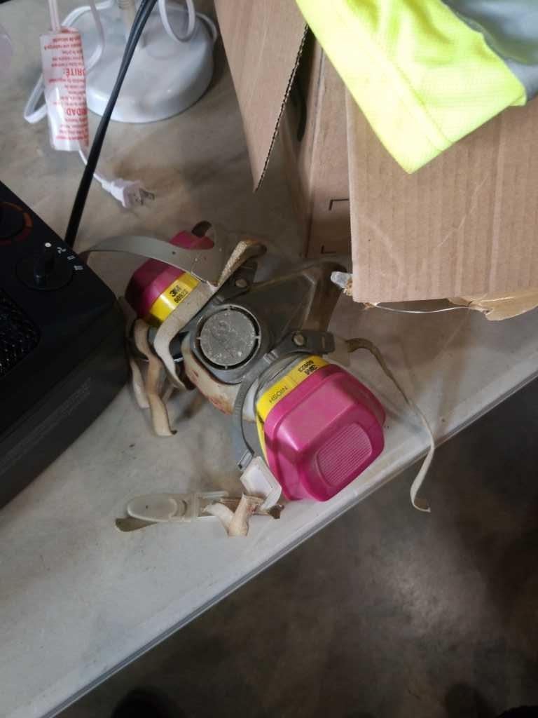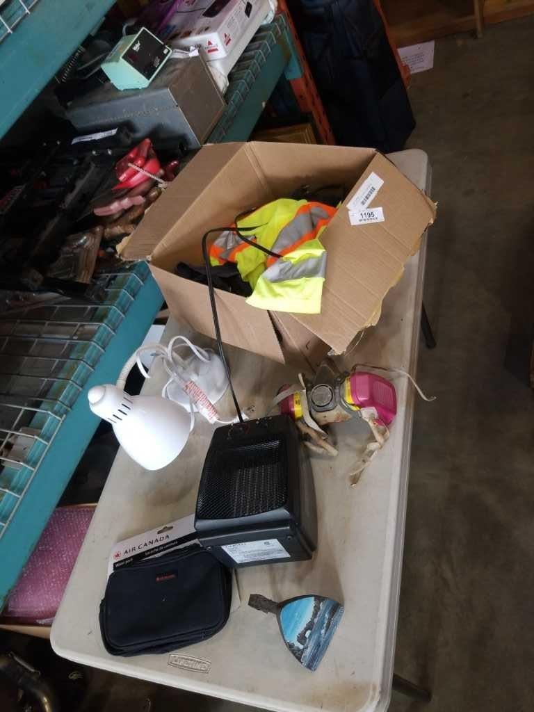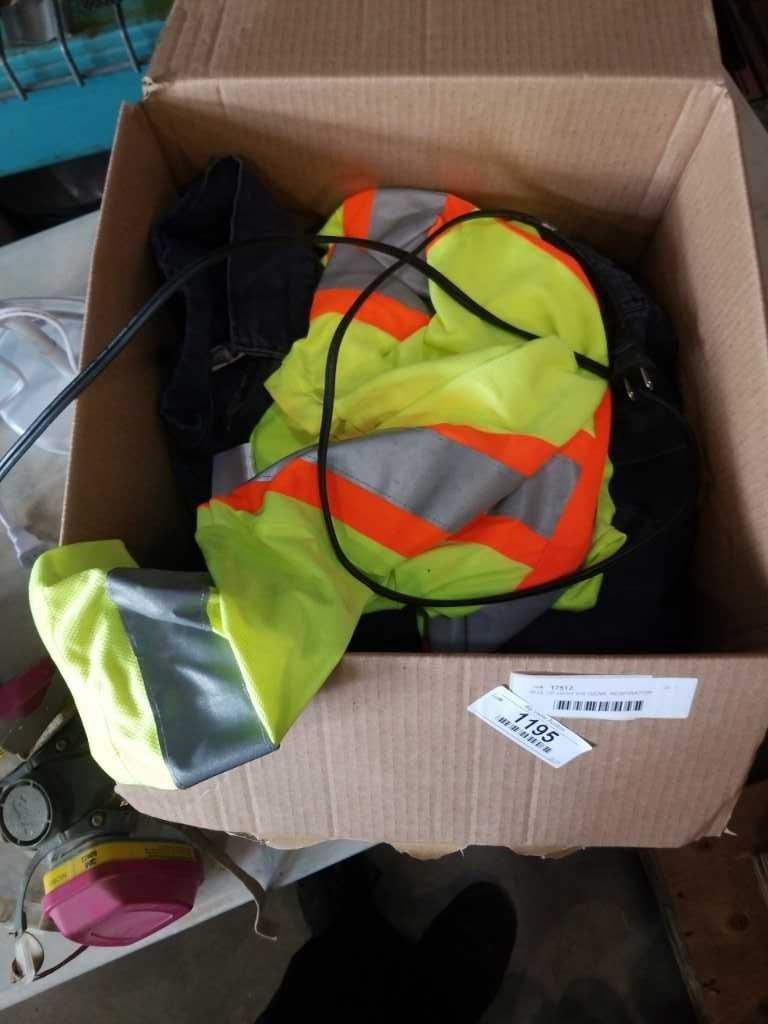 BOX OF HIGH VIS GEAR, RESPIRATOR MASK, LAMP, HEATER