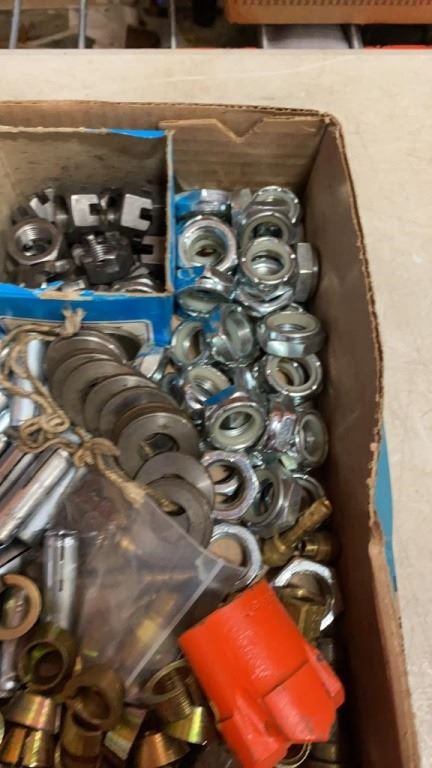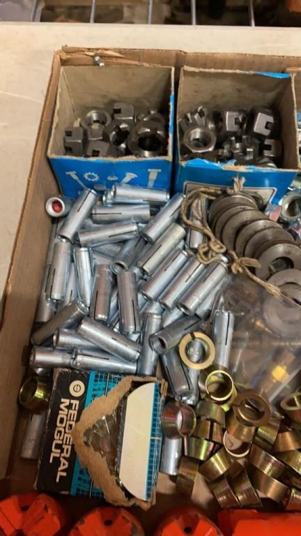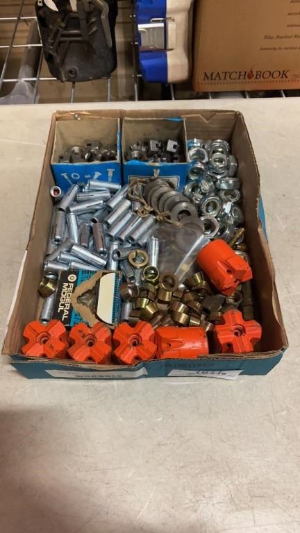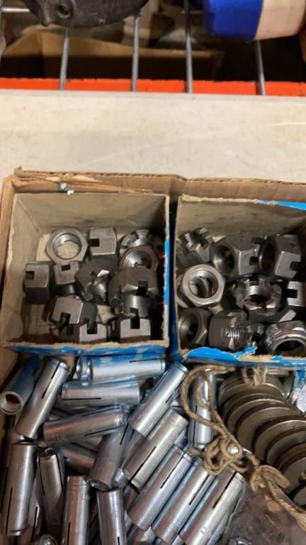 BOX OF HILTI DROPIN ANCHORS, LOCK NUTS, COTTER PINS NUTS AND MORE