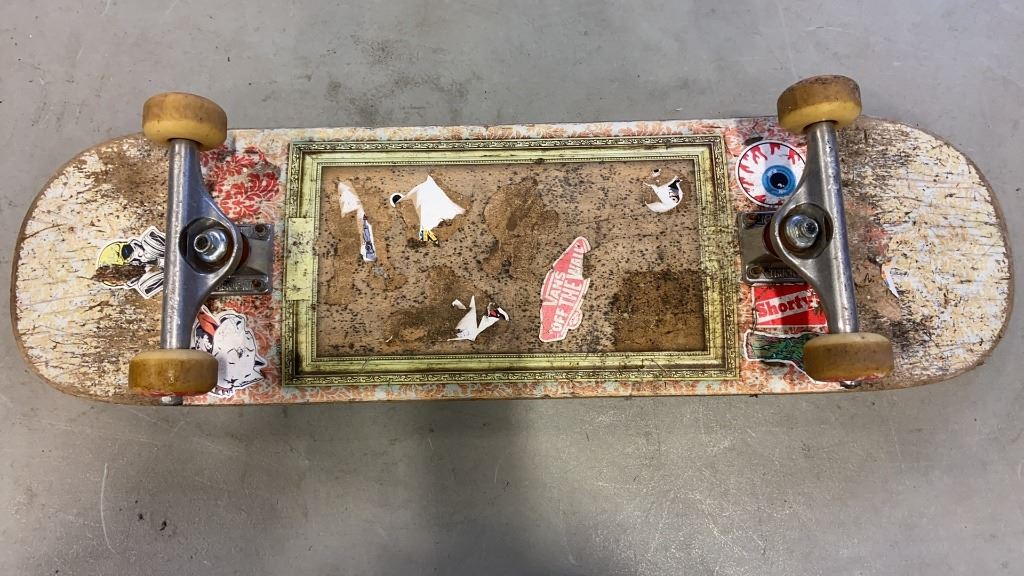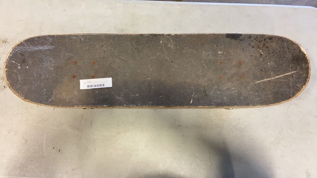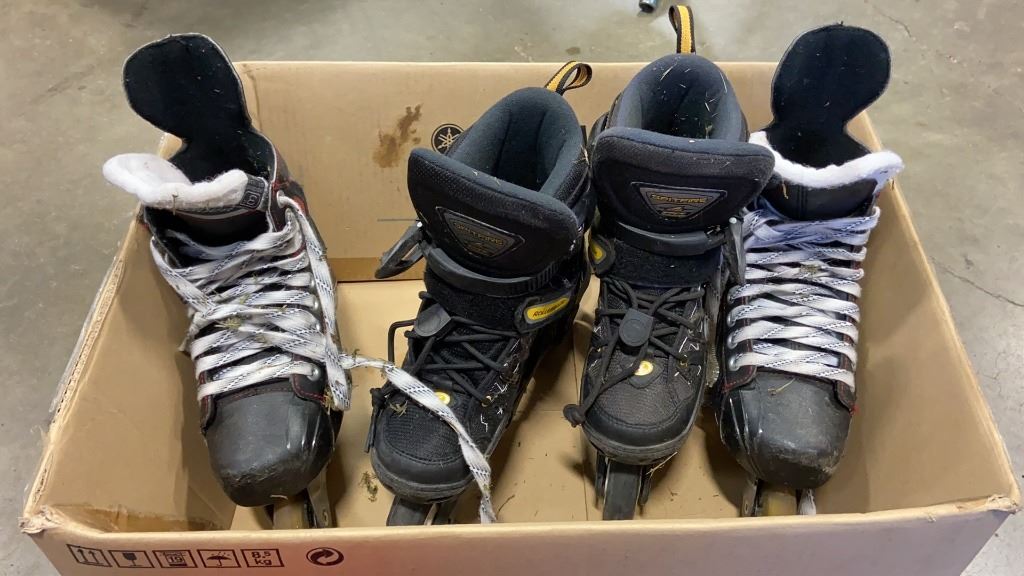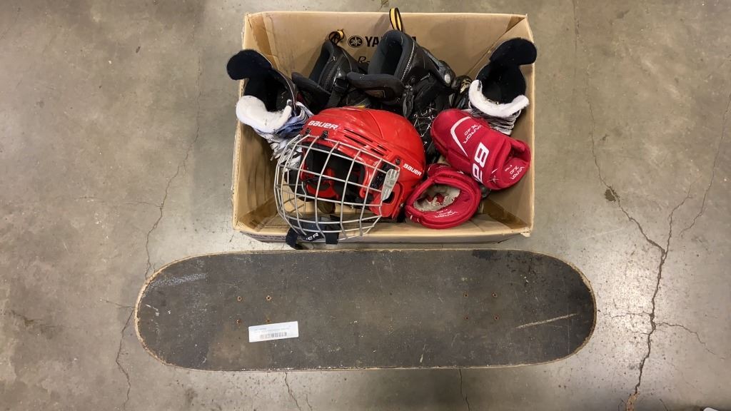 BOX OF HOCKEY PROTECTIVE GEAR, INLINE SKATES AND SKATEBOARD