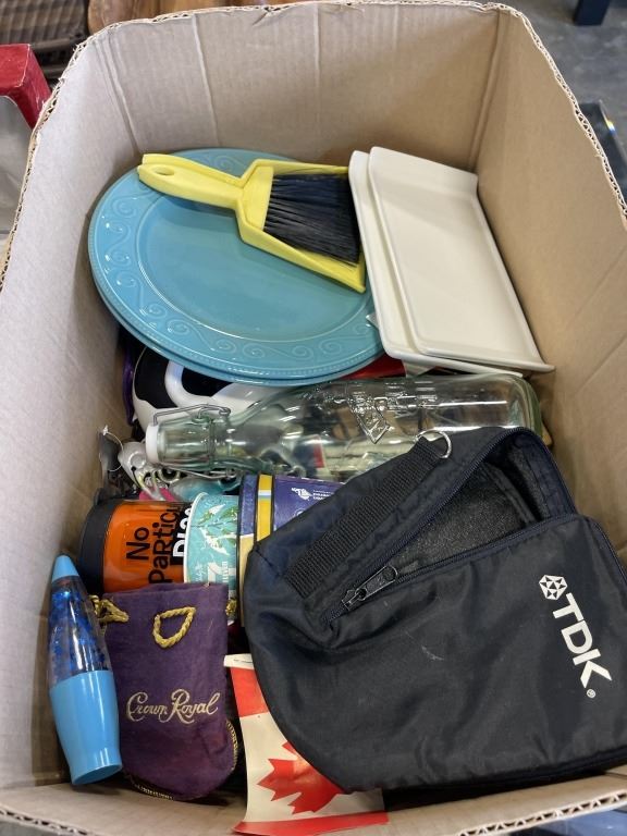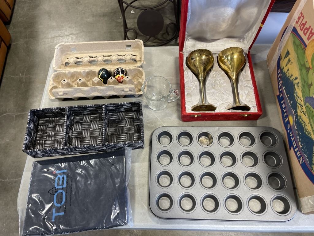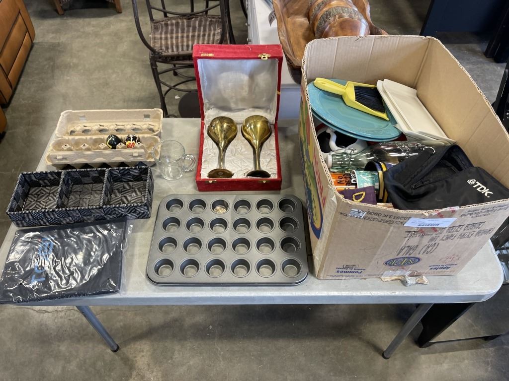 BOX OF HOUSEHOLD ITEMS WITH PAINTED EASTER EGGS