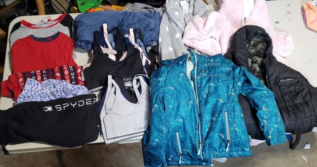 BOX OF KIDS SIZE 8 - 18 CLOTHES, 16 AS NEW CALVIN KLEIN TRAINING BRAS DISNEY PULLOVER, HOUSECOAT, EDDIE BAUER JACKET AND MORE