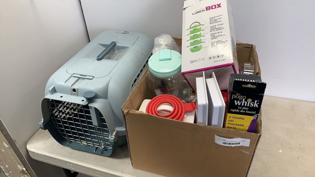 BOX OF KITCHEN ITEMS AND CAT CARRIER