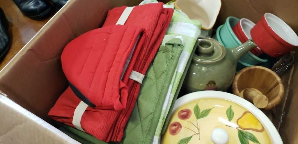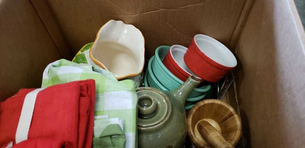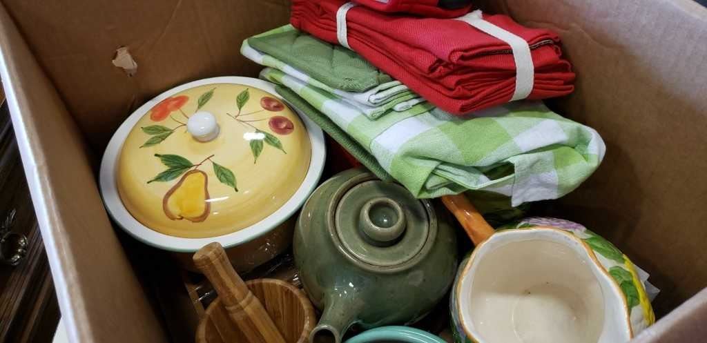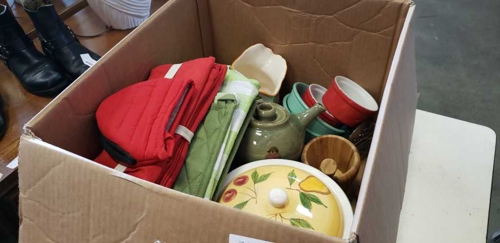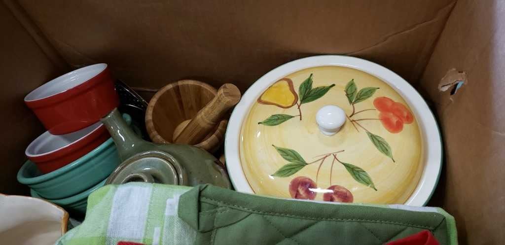 BOX OF KITCHEN ITEMS, WOOD HANDLED UTENSILS, CERAMICS