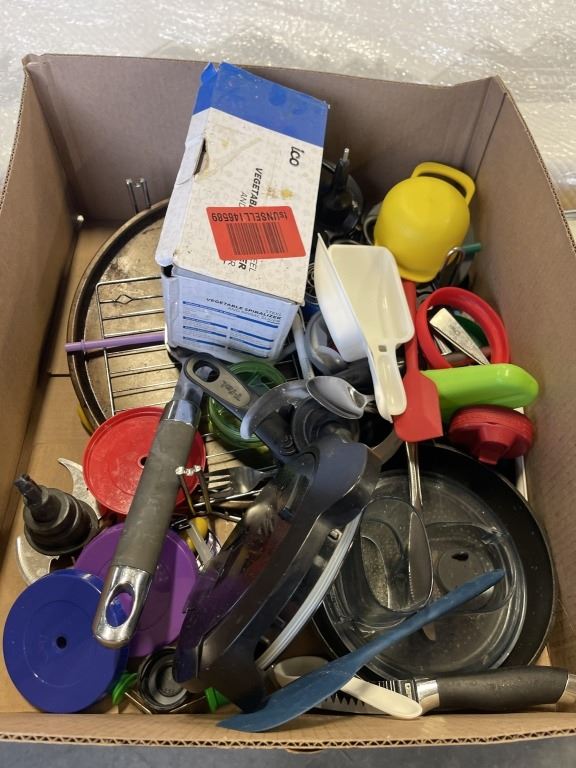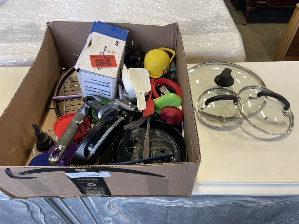 BOX OF KITCHEN UTENSILS AND KITCHEN SUPPLIES