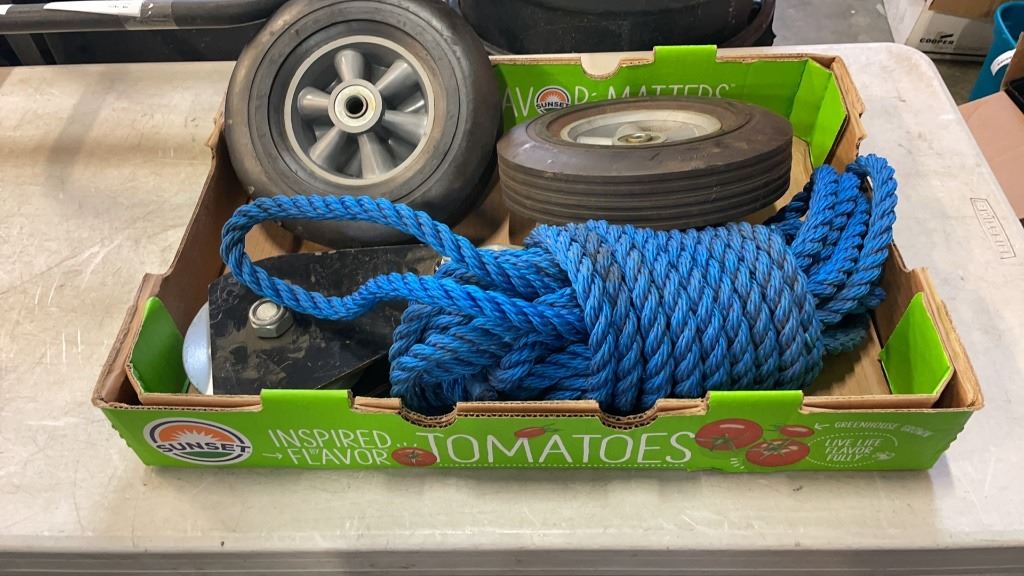 BOX OF LARGE PULLEY WITH ROPE, CART WHEELS AND 2 JUGS OF 5W-20 MOTOR OIL