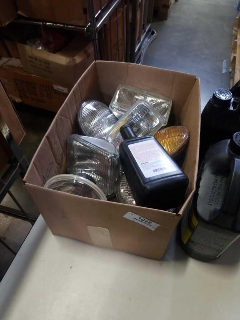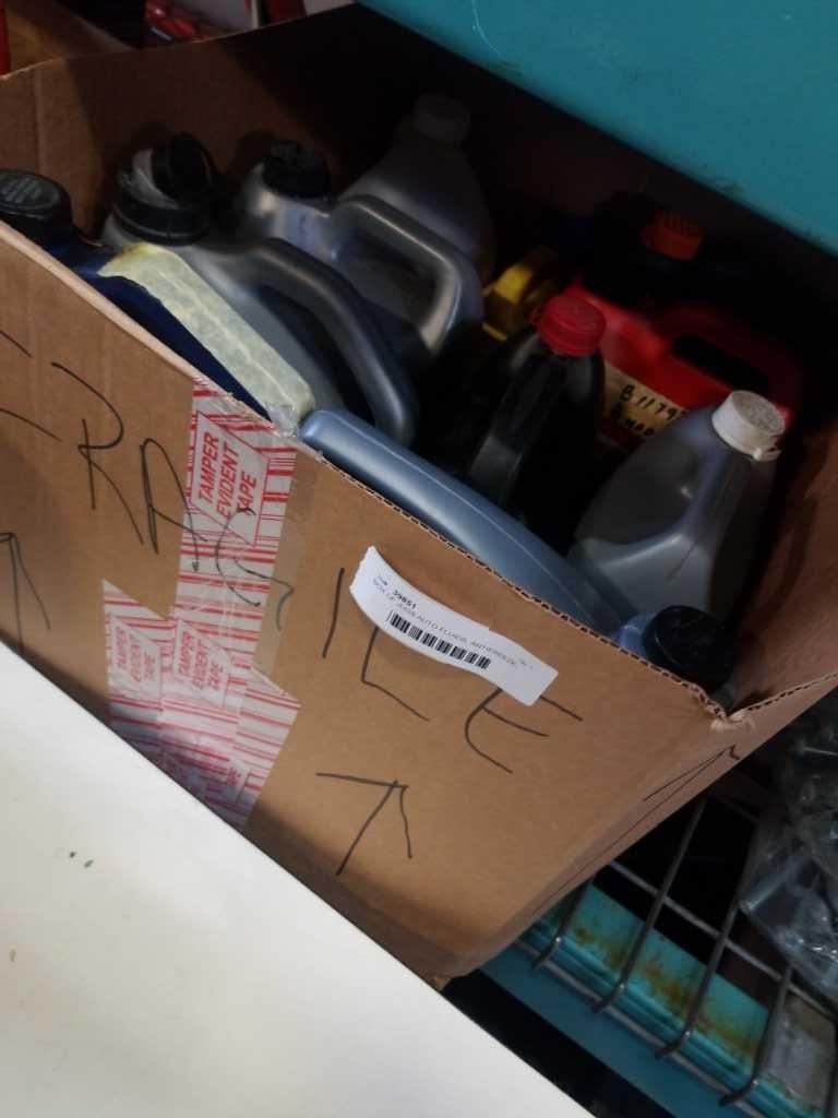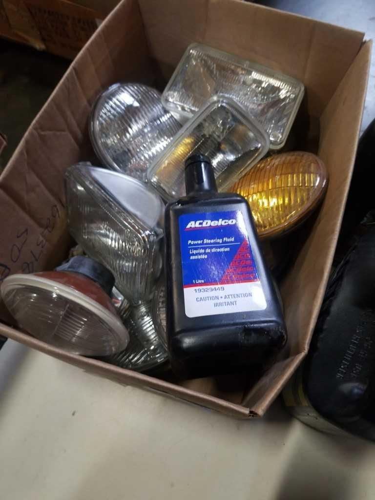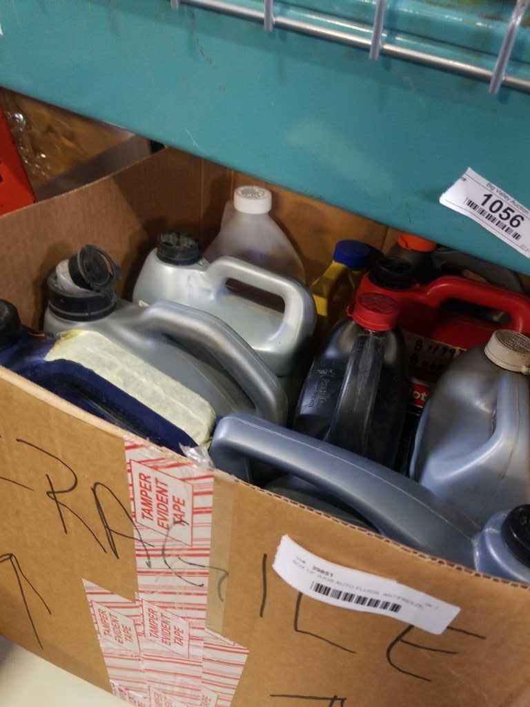 BOX OF LIGHTS WITH JUGS AUTO FLUIDS, ANTIFREEZE, SOME OIL