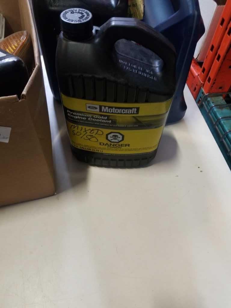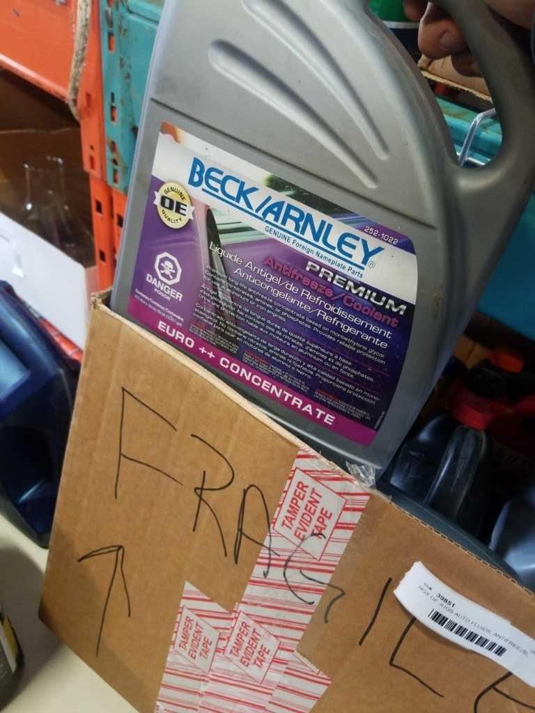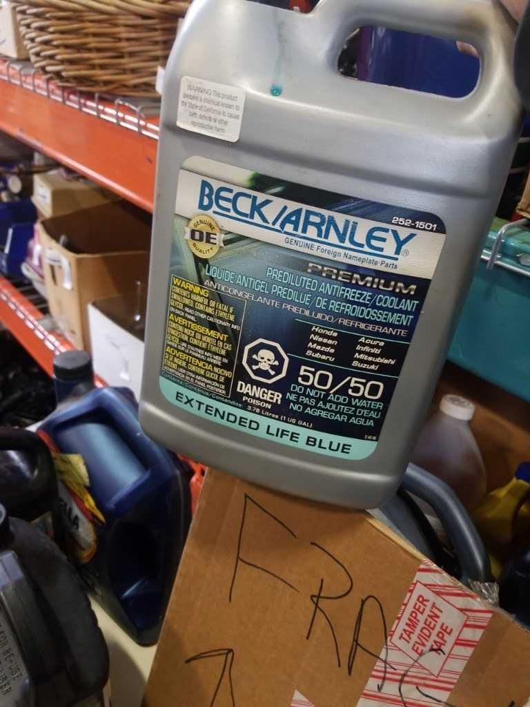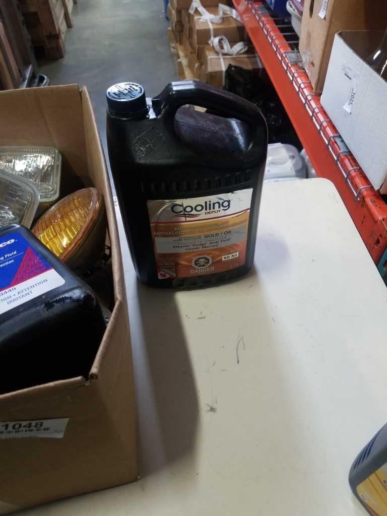 BOX OF LIGHTS WITH JUGS AUTO FLUIDS, ANTIFREEZE, SOME OIL