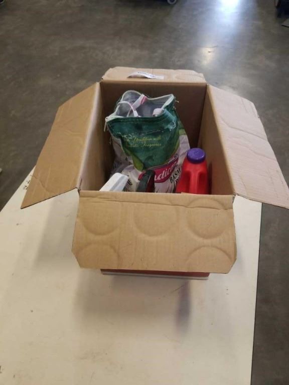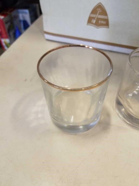BOX OF LIQUOR GLASSES, CRYSTAL GLASSES AND CLEANING SUPPLIES