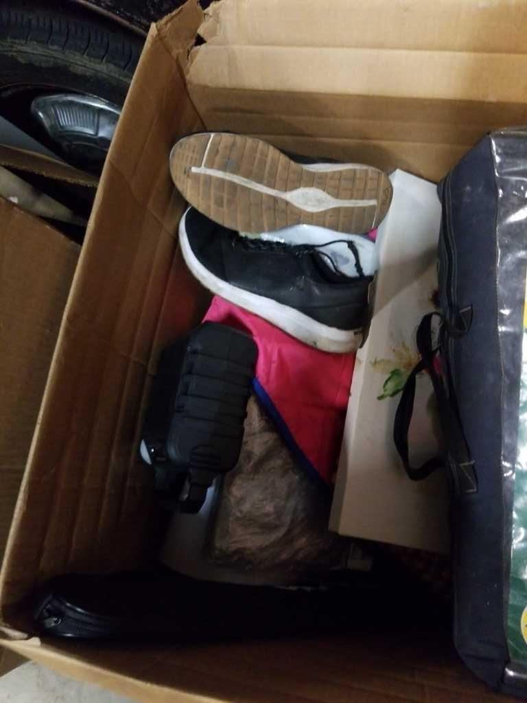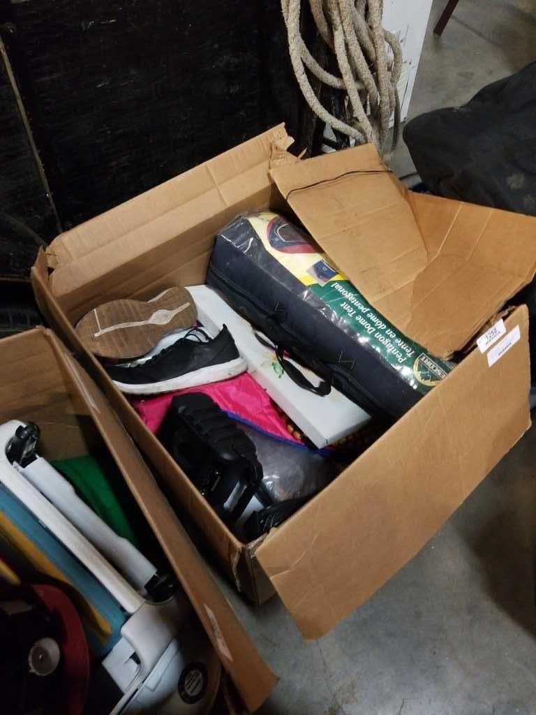 BOX OF LOST PROPERTY ITEMS, KEYBOARD. ELECTRONICS, BEADED SEAT COVER AND MORE