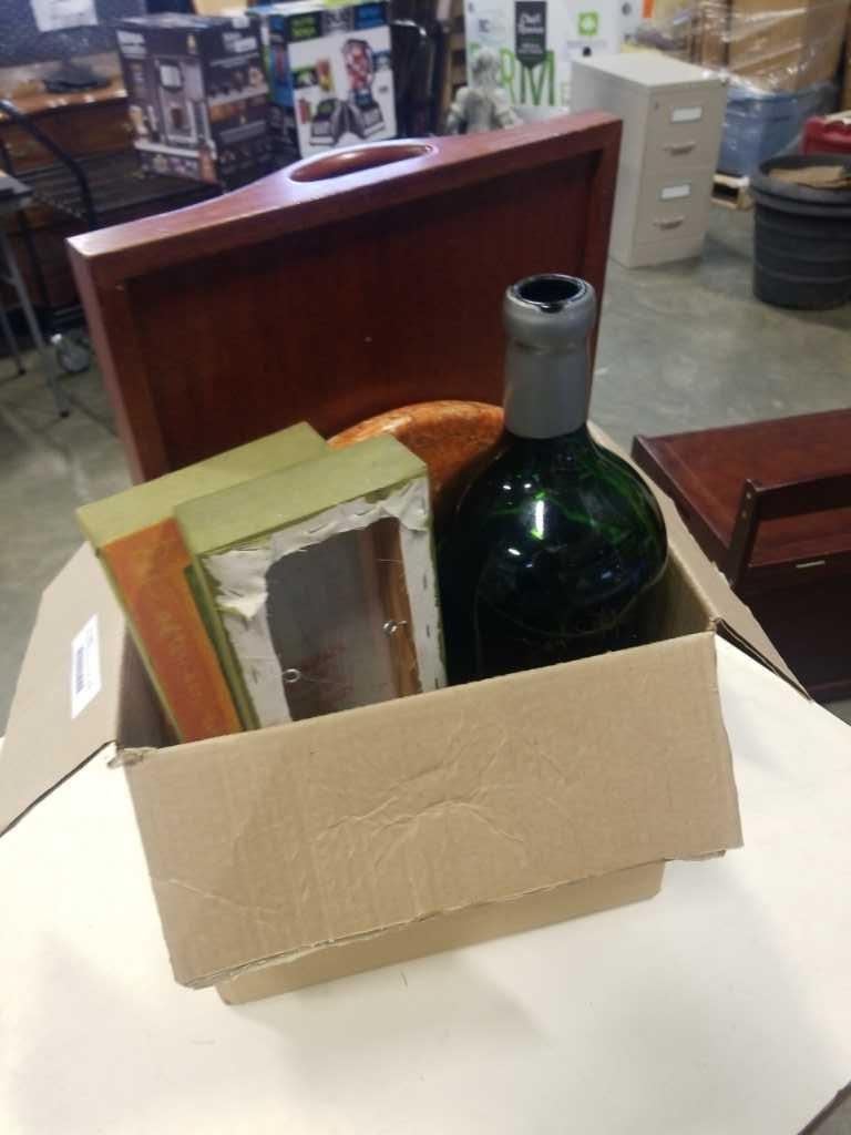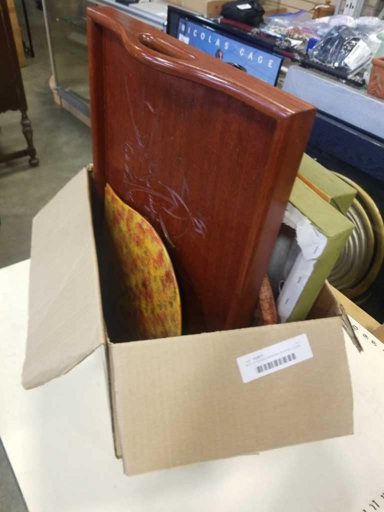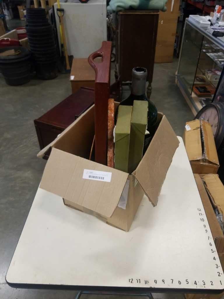 BOX OF MARBLE SERVING PLATTER, CEDAR STUDIOS CANVAS, STONE CHESS TRAY AND 5 GALLON MERLOT BOTTLE LIV