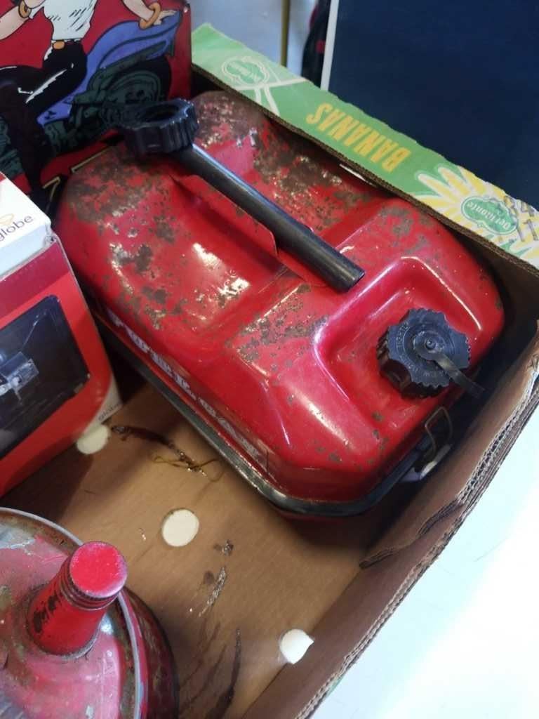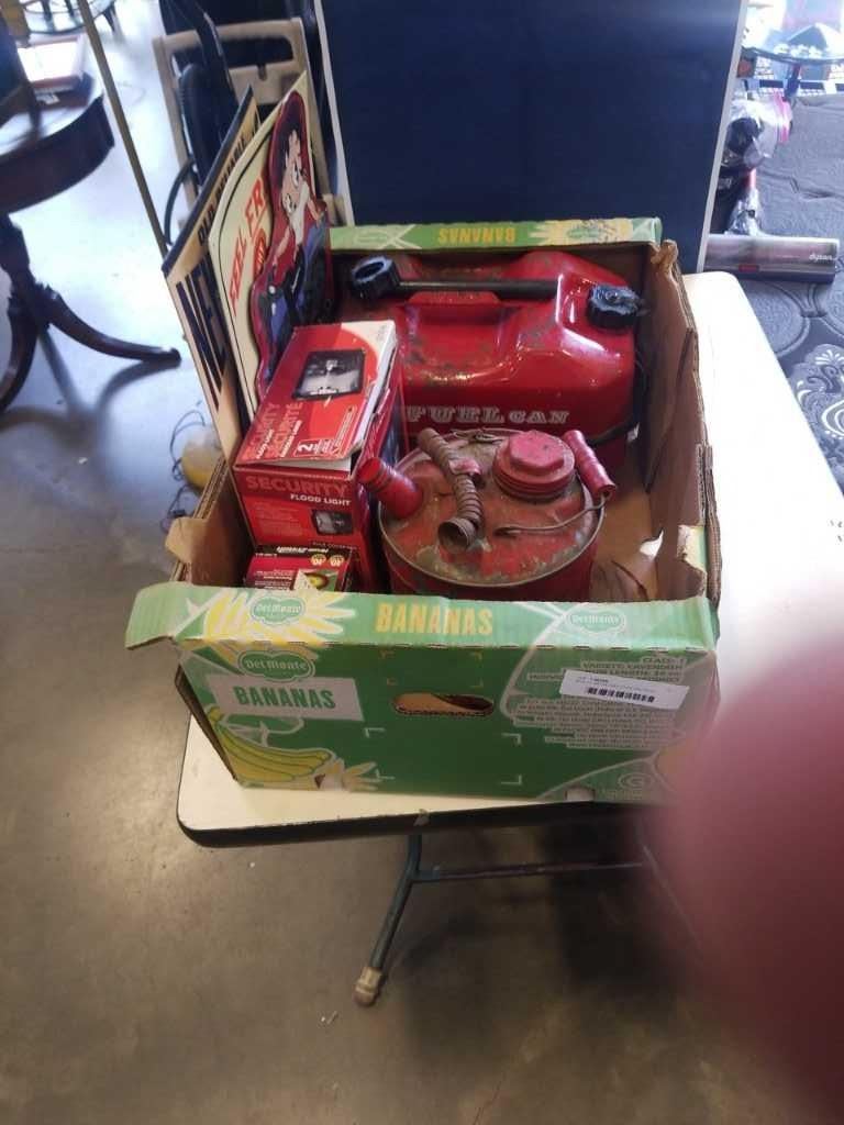 BOX OF METAL GAS CANS AND 4 METAL SIGNS
